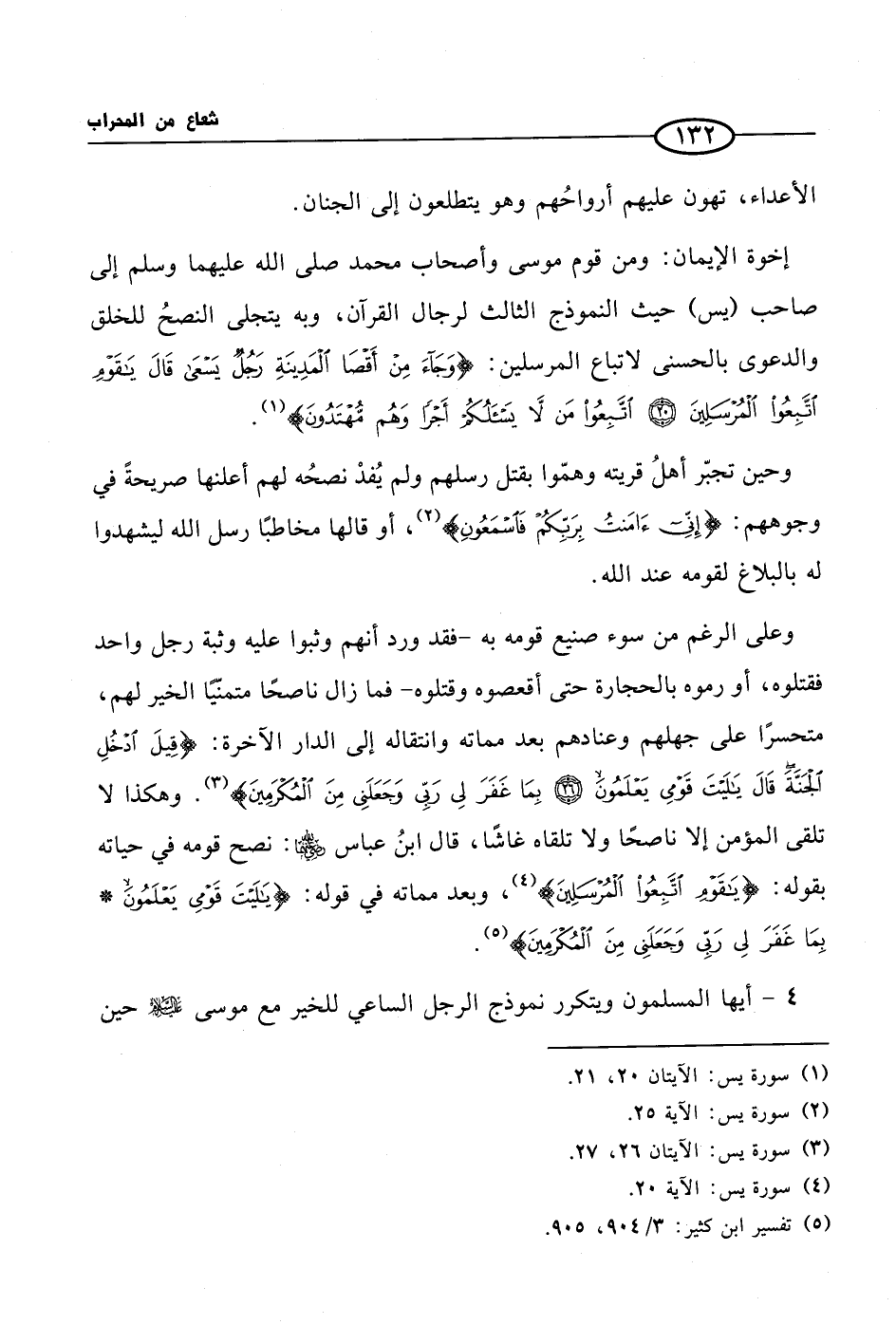 إخوة الإيمان: ومن قوم موسى وأصحاب محمد صلى الله عليهما وسلم إلى صاحب (يس) حيث النموذج الثالث لرجال القرآن، وبه يتجلى النصحُ للخلق والدعوى بالحسنى لاتباع المرسلين: {وَجَاءَ مِنْ أَقْصَى الْمَدِينَةِ رَجُلٌ يَسْعَى قَالَ يَا قَوْمِ اتَّبِعُوا الْمُرْسَلِينَ (20) اتَّبِعُوا مَن لاَّ يَسْأَلُكُمْ أَجْرًا وَهُم مُّهْتَدُونَ} (¬1).