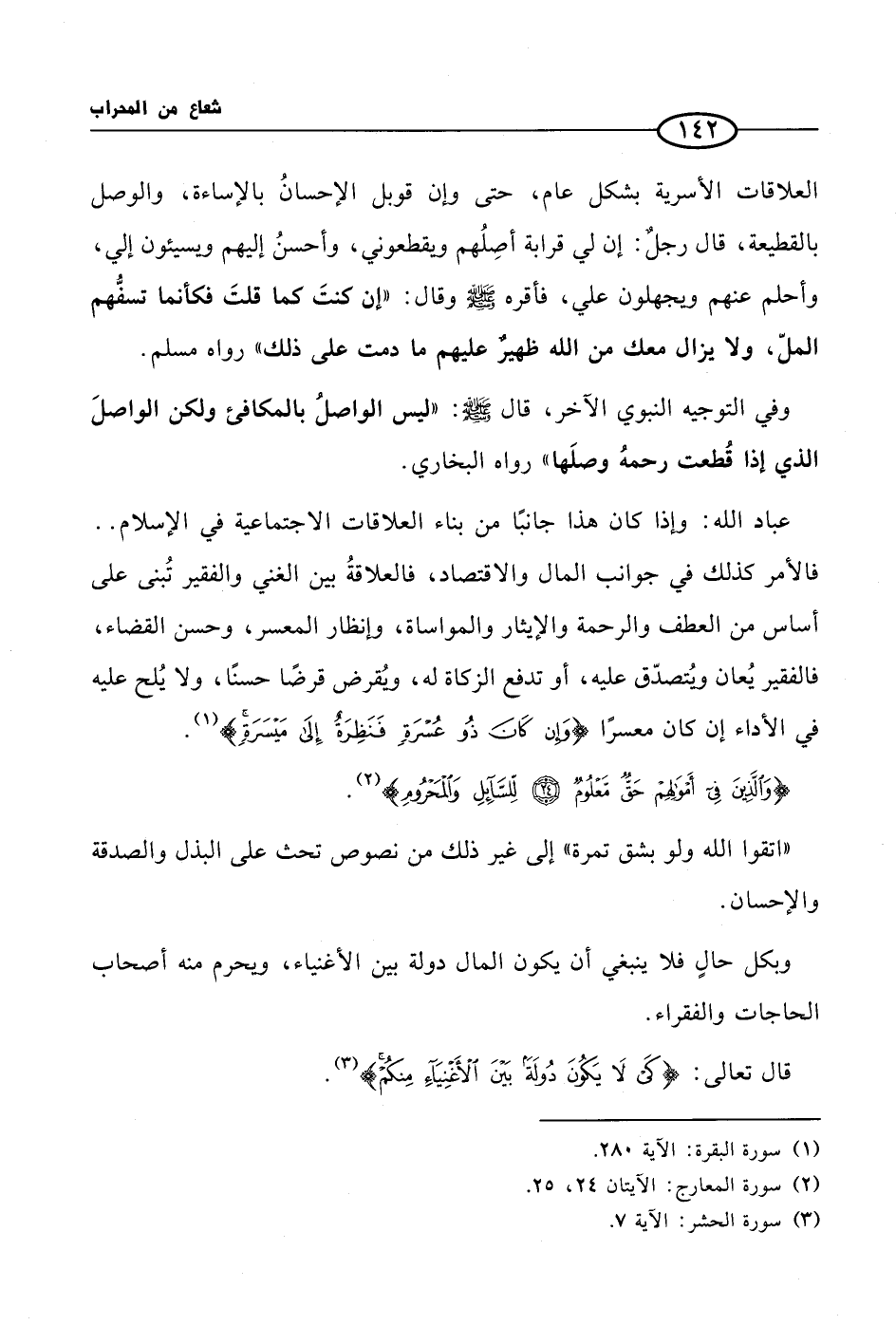 العلاقات الأسرية بشكل عام، حتى وإن قوبل الإحسانُ بالإساءة، والوصل بالقطيعة، قال رجلٌ: إن لي قرابة أصِلُهم ويقطعوني، وأحسنُ إليهم ويسيئون إلي، وأحلم عنهم ويجهلون علي، فأقره صلى الله عليه وسلم وقال: «إن كنتَ كما قلتَ فكأنما تسفُّهم الملّ، ولا يزال معك من الله ظهيرٌ عليهم ما دمت على ذلك» رواه مسلم. وفي التوجيه النبوي الآخر، قال صلى الله عليه وسلم: «ليس الواصلُ بالمكافئ ولكن الواصلَ الذي إذا قُطعت رحمهُ وصلَها» رواه البخاري.
