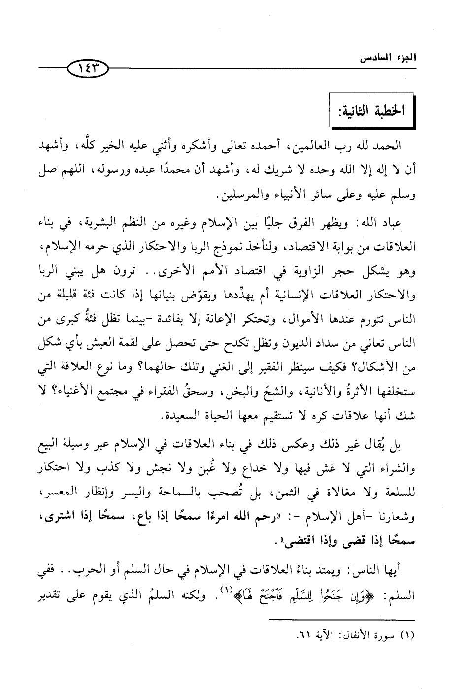 أيها الناس: ويمتد بناءُ العلاقات في الإسلام في حال السلم أو الحرب .. ففي السلم: {وَإِن جَنَحُوا لِلسَّلْمِ فَاجْنَحْ لَهَا} (¬1). ولكنه السلمُ الذي يقوم على تقدير