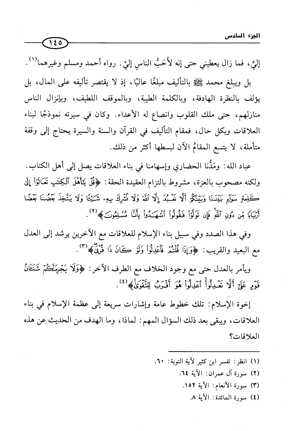 عباد الله: ومَدُّنا الحضاري وإسهامنا في بناء العلاقات يصل إلى أهل الكتاب. ولكنه مصحوب بالعزة، مشروط بالتزام العقيدة الحقة: {قُلْ يَا أَهْلَ الْكِتَابِ تَعَالَوْا إِلَى كَلِمَةٍ سَوَاءٍ بَيْنَنَا وَبَيْنَكُمْ أَلاَّ نَعْبُدَ إِلاَّ اللَّهَ وَلاَ نُشْرِكَ بِهِ شَيْئًا وَلاَ يَتَّخِذَ بَعْضُنَا بَعْضًا أَرْبَابًا مِّن دُونِ اللَّهِ فَإِن تَوَلَّوْا فَقُولُوا اشْهَدُوا بِأَنَّا مُسْلِمُونَ} (¬2).
