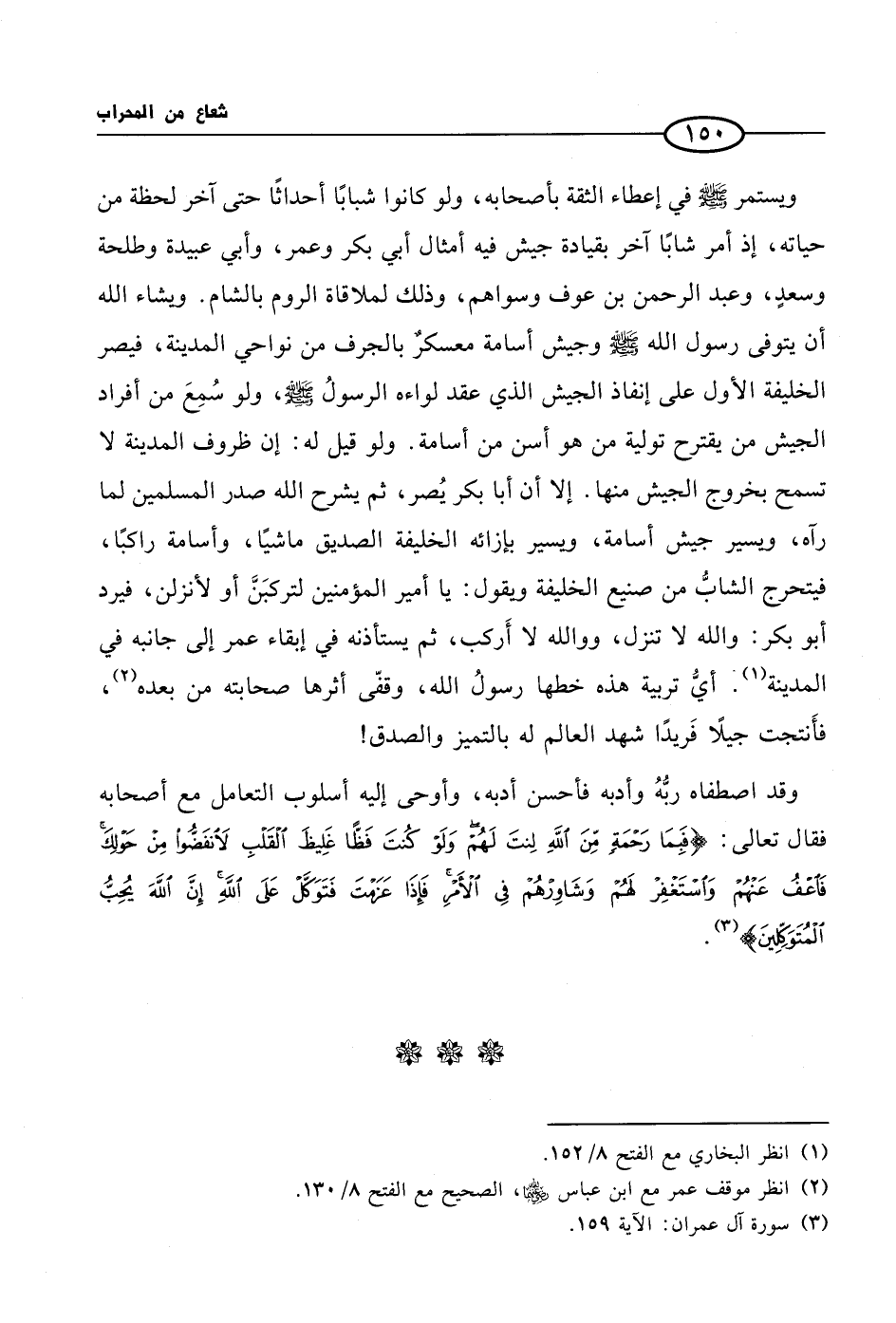ويستمر صلى الله عليه وسلم في إعطاء الثقة بأصحابه، ولو كانوا شبابًا أحداثًا حتى آخر لحظة من حياته، إذ أمر شابًا آخر بقيادة جيش فيه أمثال أبي بكر وعمر، وأبي عبيدة وطلحة وسعدٍ، وعبد الرحمن بن عوف وسواهم، وذلك لملاقاة الروم بالشام. ويشاء الله أن يتوفى رسول الله صلى الله عليه وسلم وجيش أسامة معسكرٌ بالجرف من نواحي المدينة، فيصر الخليفة الأول على إنفاذ الجيش الذي عقد لواءه الرسولُ صلى الله عليه وسلم، ولو سُمِعَ من أفراد الجيش من يقترح تولية من هو أسن من أسامة. ولو قيل له: إن ظروف المدينة لا تسمح بخروج الجيش منها. إلا أن أبا بكر يُصر، ثم يشرح الله صدر المسلمين لما رآه، ويسير جيش أسامة، ويسير بإزائه الخليفة الصديق ماشيًا، وأسامة راكبًا، فيتحرج الشابُّ من صنيع الخليفة ويقول: يا أمير المؤمنين لتركبَنَّ أو لأنزلن، فيرد أبو بكر: والله لا تنزل، ووالله لا أَركب، ثم يستأذنه في إبقاء عمر إلى جانبه في المدينة (¬1). أيُّ تربية هذه خطها رسولُ الله، وقفّى أثرها صحابته من بعده (¬2)، فأَنتجت جيلًا فَريدًا شهد العالم له بالتميز والصدق!