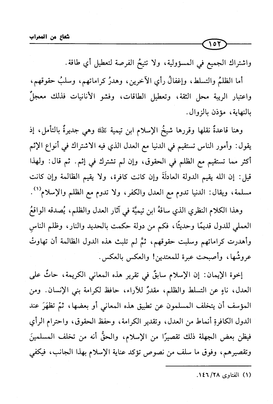 وهنا قاعدةٌ نقلها وقررها شيخُ الإسلام ابن تيمية -رحمه الله - وهي جديرةٌ بالتأمل، إذ يقول: وأمور الناس تستقيم في الدنيا مع العدل الذي فيه الاشتراك في أنواع الإثم أكثر مما تستقيم مع الظلم في الحقوق، وإن لم تشترك في إثم. ثم قال: ولهذا قيل: إن الله يقيم الدولة العادلَةَ وإن كانت كافرة، ولا يقيم الظالمة وإن كانت مسلمة، ويقال: الدنيا تدوم مع العدل والكفر، ولا تدوم مع الظلم والإسلام (¬1).