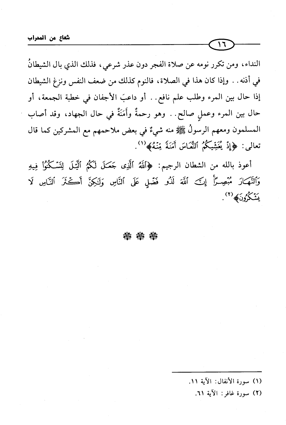 النداء، ومن تكرر نومه عن صلاة الفجر دون عذر شرعي، فذلك الذي بال الشيطانُ في أذنه .. وإذا كان هذا في الصلاة، فالنوم كذلك من ضعف النفس ونزغ الشيطان إذا حال بين المرء وطلب علم نافع .. أو داعبَ الأجفان في خطبة الجمعة، أو حال بين المرء وعملٍ صالح .. وهو رحمةٌ وأَمَنَةٌ في حال الجهاد، وقد أصاب المسلمون ومعهم الرسولُ صلى الله عليه وسلم منه شيءٌ في بعض ملاحمهم مع المشركين كما قال تعالى: {إِذْ يُغَشِّيكُمُ النُّعَاسَ أَمَنَةً مِّنْهُ} (¬1).