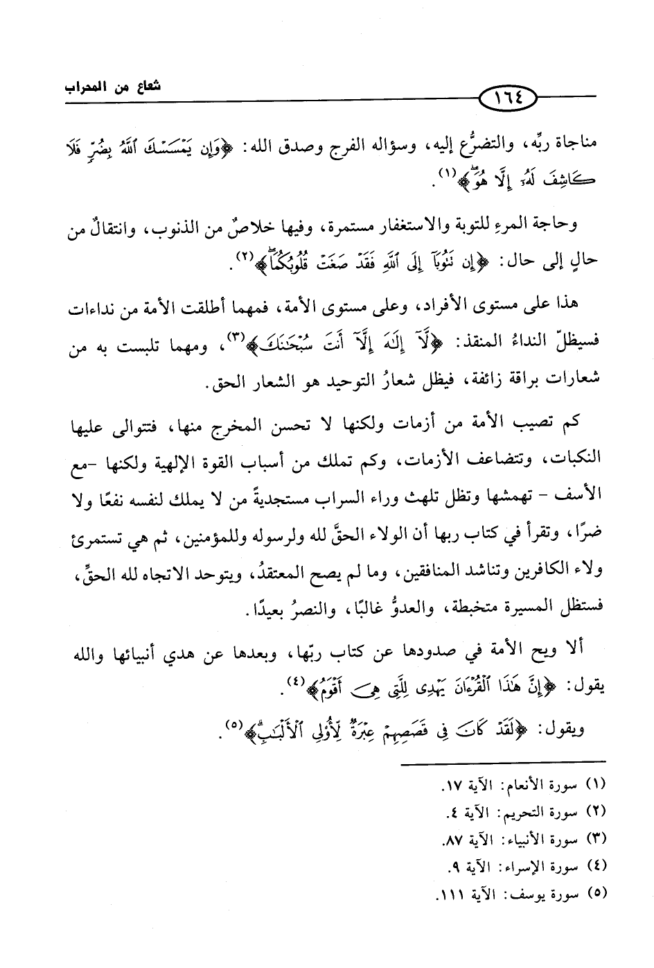 ألا ويح الأمة في صدودها عن كتاب ربّها، وبعدها عن هدي أنبيائها والله يقول: {إِنَّ هَذَا الْقُرْآنَ يِهْدِي لِلَّتِي هِيَ أَقْوَمُ} (¬4). ويقول: {لَقَدْ كَانَ فِي قَصَصِهِمْ عِبْرَةٌ لِّأُوْلِي الأَلْبَابِ} (¬5).
