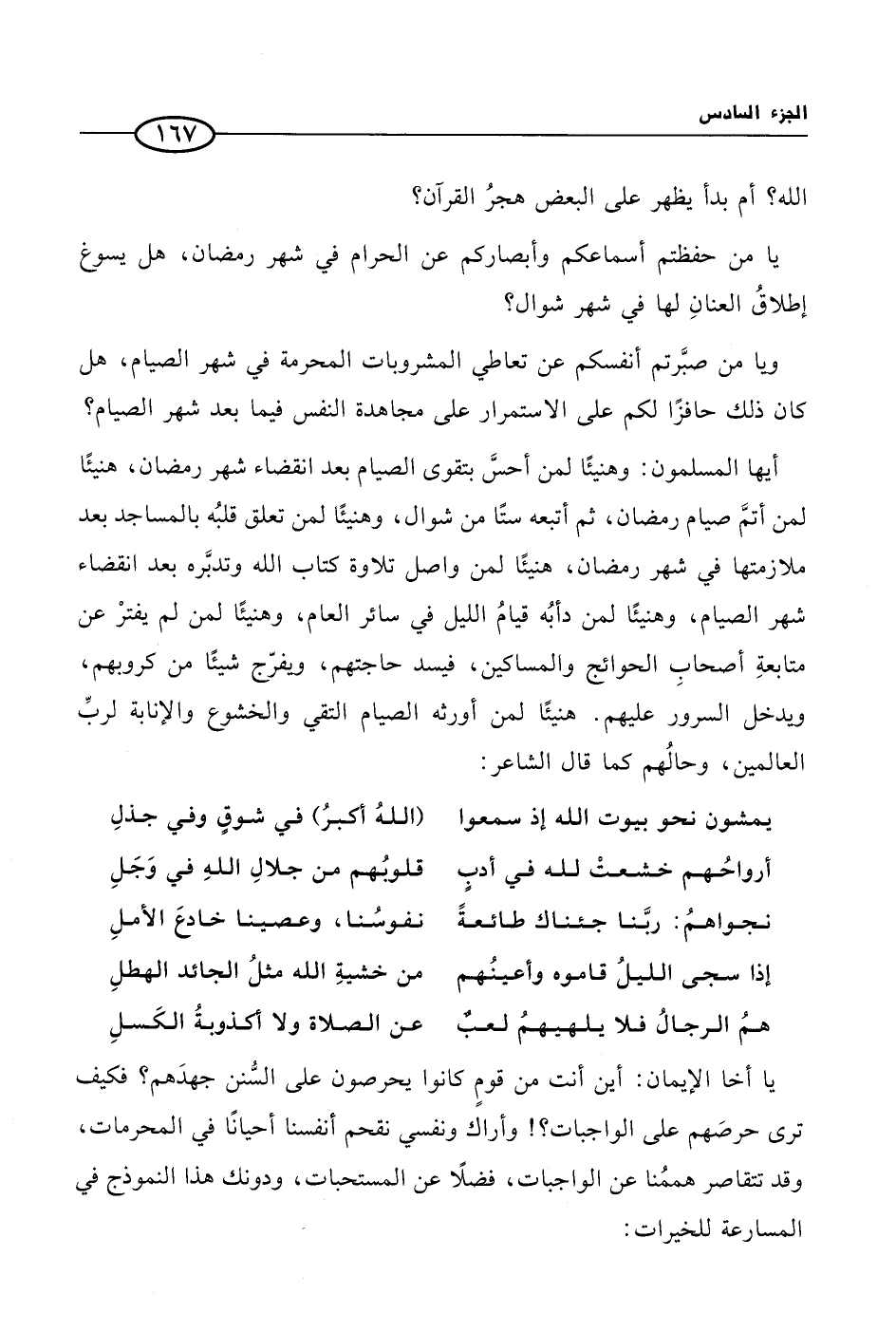أيها المسلمون: وهنيئًا لمن أحسَّ بتقوى الصيام بعد انقضاء شهر رمضان، هنيئًا لمن أتمَّ صيام رمضان، ثم أتبعه ستًا من شوال، وهنيئًا لمن تعلق قلبُه بالمساجد بعد ملازمتها في شهر رمضان، هنيئًا لمن واصل تلاوة كتاب الله وتدبَّره بعد انقضاء شهر الصيام، وهنيئًا لمن دأبُه قيامُ الليل في سائر العام، وهنيئًا لمن لم يفترْ عن متابعةِ أصحابِ الحوائج والمساكين، فيسد حاجتهم، ويفرّج شيئًا من كروبهم، ويدخل السرور عليهم. هنيئًا لمن أورثه الصيام التقي والخشوع والإنابة لربِّ العالمين، وحالُهم كما قال الشاعر: