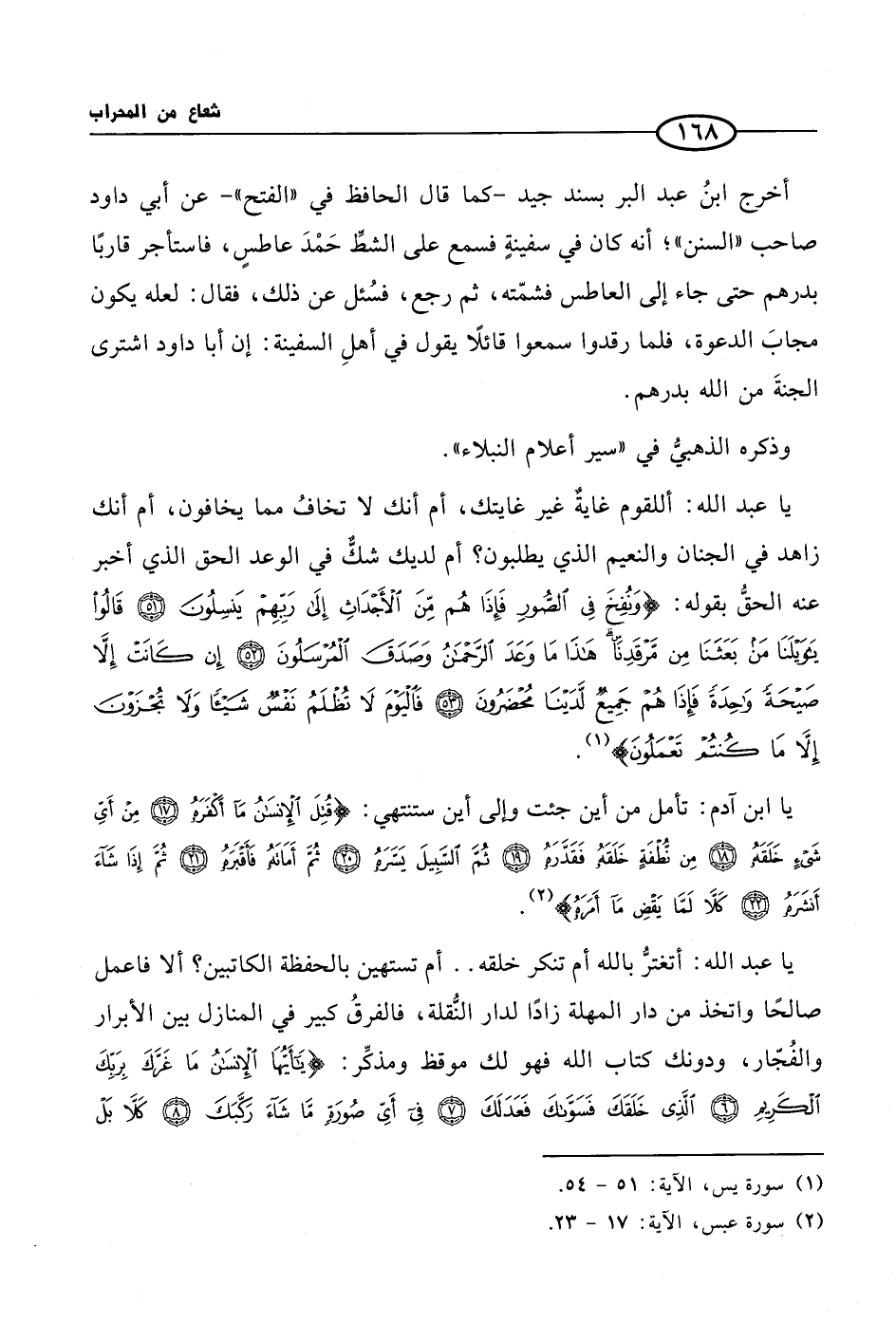 يا عبد الله: أللقوم غايةٌ غير غايتك، أم أنك لا تخافُ مما يخافون، أم أنك زاهد في الجنان والنعيم الذي يطلبون؟ أم لديك شكٌّ في الوعد الحق الذي أخبر عنه الحقُّ بقوله: {وَنُفِخَ فِي الصُّورِ فَإِذَا هُمْ مِنَ الْأَجْدَاثِ إِلَى رَبِّهِمْ يَنْسِلُونَ (51) قَالُوا يَا وَيْلَنَا مَنْ بَعَثَنَا مِنْ مَرْقَدِنَا هَذَا مَا وَعَدَ الرَّحْمَنُ وَصَدَقَ الْمُرْسَلُونَ (52) إِنْ كَانَتْ إِلَّا صَيْحَةً وَاحِدَةً فَإِذَا هُمْ جَمِيعٌ لَدَيْنَا مُحْضَرُونَ (53) فَالْيَوْمَ لَا تُظْلَمُ نَفْسٌ شَيْئًا وَلَا تُجْزَوْنَ إِلَّا مَا كُنْتُمْ تَعْمَلُونَ} (¬1).