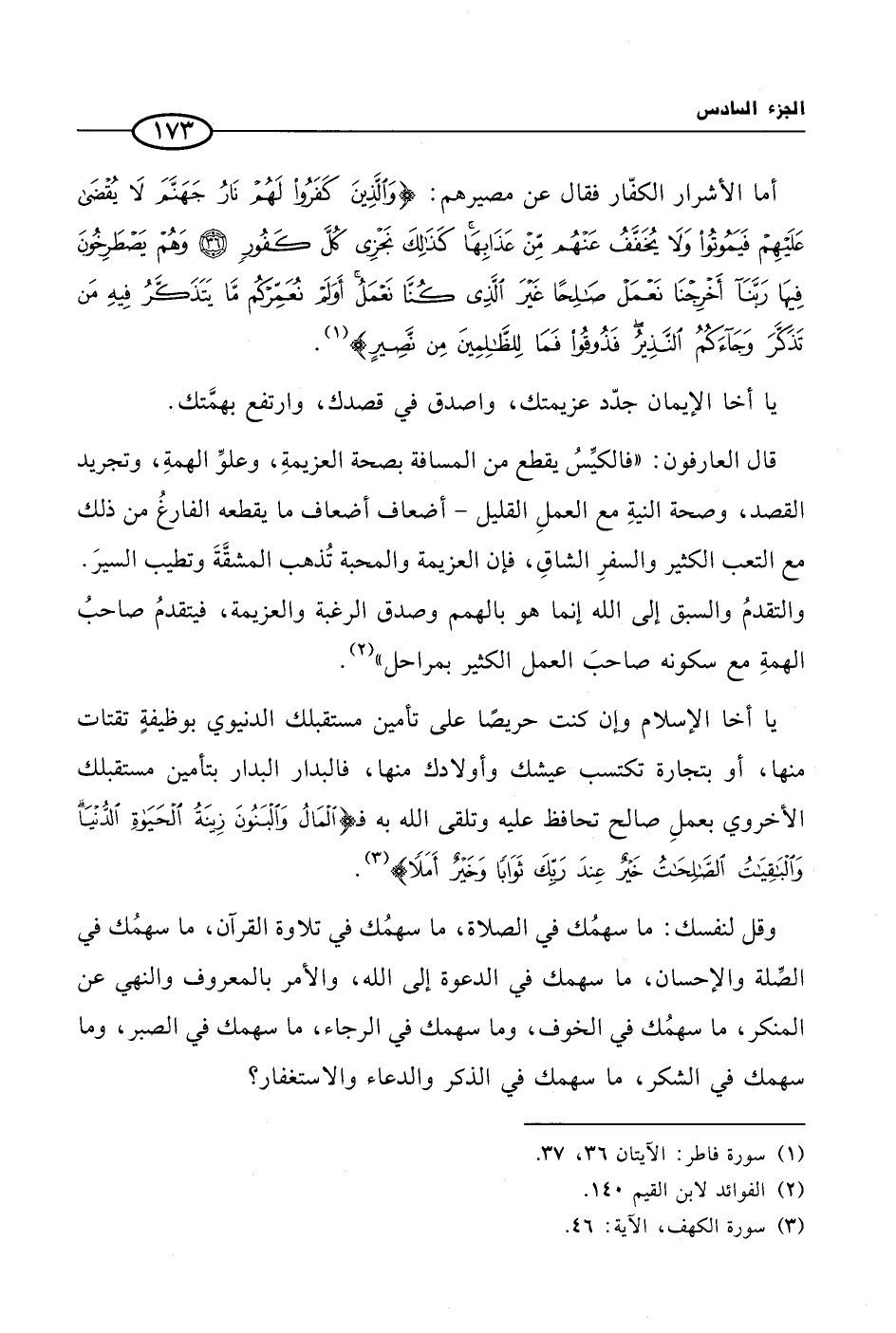 وقل لنفسك: ما سهمُك في الصلاة، ما سهمُك في تلاوة القرآن، ما سهمُك في الصِّلة والإحسان، ما سهمك في الدعوة إلى الله، والأمر بالمعروف والنهي عن المنكر، ما سهمُك في الخوف، وما سهمك في الرجاء، ما سهمك في الصبر، وما سهمك في الشكر، ما سهمك في الذكر والدعاء والاستغفار؟