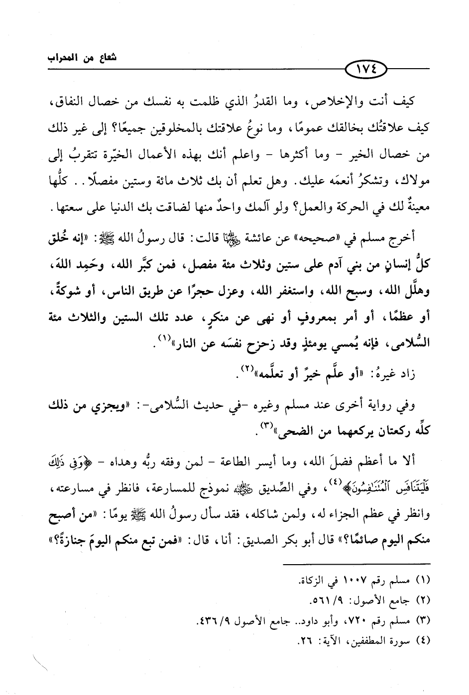 كيف أنت والإخلاص، وما القدرُ الذي ظلمت به نفسك من خصال النفاق، كيف علاقتُك بخالقك عمومًا، وما نوعُ علاقتك بالمخلوقين جميعًا؟ إلى غير ذلك من خصال الخير - وما أكثرها - واعلم أنك بهذه الأعمال الخيّرة تتقربُ إلى مولاك، وتشكرُ أنعمَه عليك. وهل تعلم أن بك ثلاث مائة وستين مفصلًا .. كلُّها معينةٌ لك في الحركة والعمل؟ ولو آلمك واحدٌ منها لضاقت بك الدنيا على سعتها.