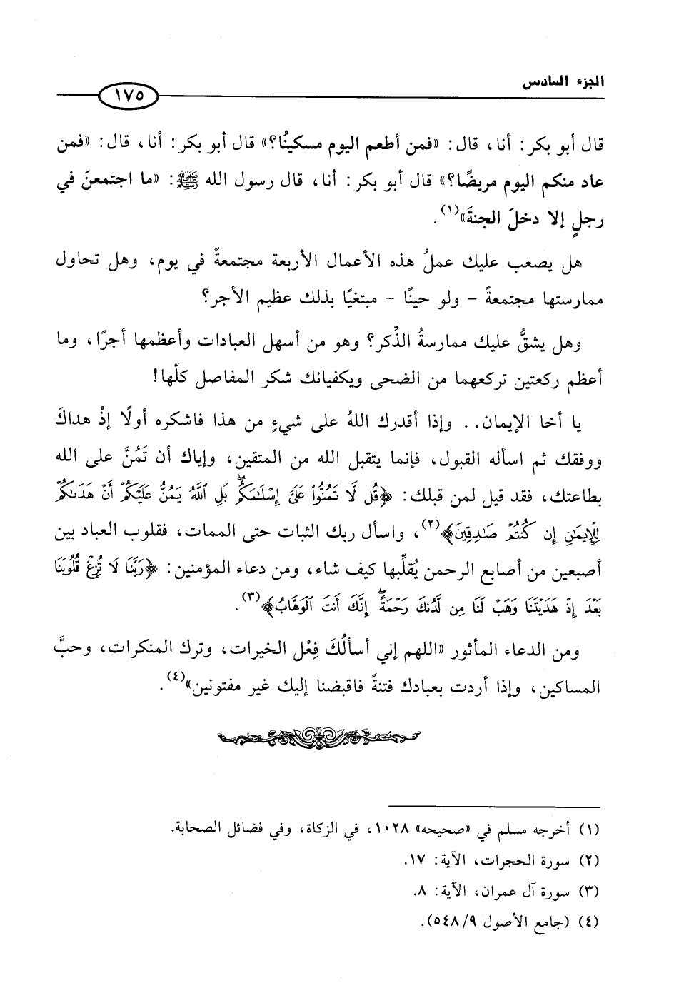 يا أخا الإيمان .. وإذا أقدرك اللهُ على شيءٍ من هذا فاشكره أولًا إذْ هداكَ ووفقك ثم اسأله القبول، فإنما يتقبل الله من المتقين، وإياك أن تَمُنَّ على الله بطاعتك، فقد قيل لمن قبلك: {قُلْ لَا تَمُنُّوا عَلَيَّ إِسْلَامَكُمْ بَلِ اللَّهُ يَمُنُّ عَلَيْكُمْ أَنْ هَدَاكُمْ لِلْإِيمَانِ إِنْ كُنْتُمْ صَادِقِينَ} (¬2)، واسأل ربك الثبات حتى الممات، فقلوب العباد بين أصبعين من أصابع الرحمن يُقلِّبها كيف شاء، ومن دعاء المؤمنين: {رَبَّنَا لَا تُزِغْ قُلُوبَنَا بَعْدَ إِذْ هَدَيْتَنَا وَهَبْ لَنَا مِنْ لَدُنْكَ رَحْمَةً إِنَّكَ أَنْتَ الْوَهَّابُ} (¬3).