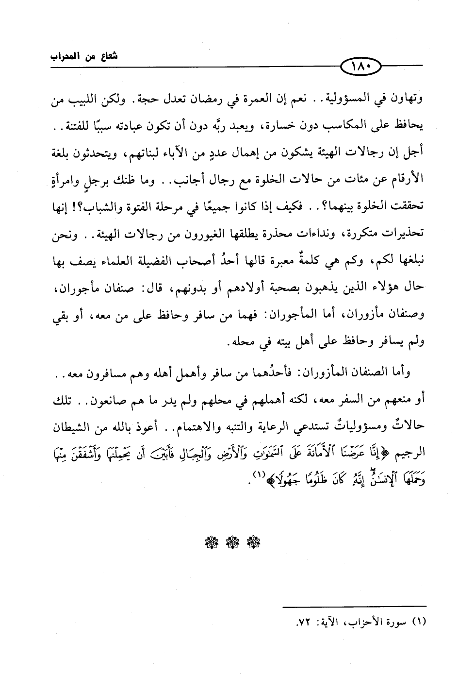 وتهاون في المسؤولية .. نعم إن العمرة في رمضان تعدل حجة. ولكن اللبيب من يحافظ على المكاسب دون خسارة، ويعبد ربَّه دون أن تكون عبادته سببًا للفتنة .. أجل إن رجالات الهيئة يشكون من إهمال عددٍ من الآباء لبناتهم، ويتحدثون بلغة الأرقام عن مئات من حالات الخلوة مع رجال أجانب .. وما ظنك برجلٍ وامرأةٍ تحققت الخلوة بينهما؟ .. فكيف إذا كانوا جميعًا في مرحلة الفتوة والشباب؟ ! إنها تحذيرات متكررة، ونداءات محذرة يطلقها الغيورون من رجالات الهيئة .. ونحن نبلغها لكم، وكم هي كلمةٌ معبرة قالها أحدُ أصحاب الفضيلة العلماء يصف بها حال هؤلاء الذين يذهبون بصحبة أولادهم أو بدونهم، قال: صنفان مأجوران، وصنفان مأزوران، أما المأجوران: فهما من سافر وحافظ على من معه، أو بقي ولم يسافر وحافظ على أهل بيته في محله. وأما الصنفان المأزوران: فأحدُهما من سافر وأهمل أهله وهم مسافرون معه .. أو منعهم من السفر معه، لكنه أهملهم في محلهم ولم يدر ما هم صانعون .. تلك حالاتٌ ومسؤولياتٌ تستدعي الرعاية والتنبه والاهتمام .. أعوذ بالله من الشيطان الرجيم {إِنَّا عَرَضْنَا الْأَمَانَةَ عَلَى السَّمَوَاتِ وَالْأَرْضِ وَالْجِبَالِ فَأَبَيْنَ أَنْ يَحْمِلْنَهَا وَأَشْفَقْنَ مِنْهَا وَحَمَلَهَا الْإِنْسَانُ إِنَّهُ كَانَ ظَلُومًا جَهُولًا} (¬1).