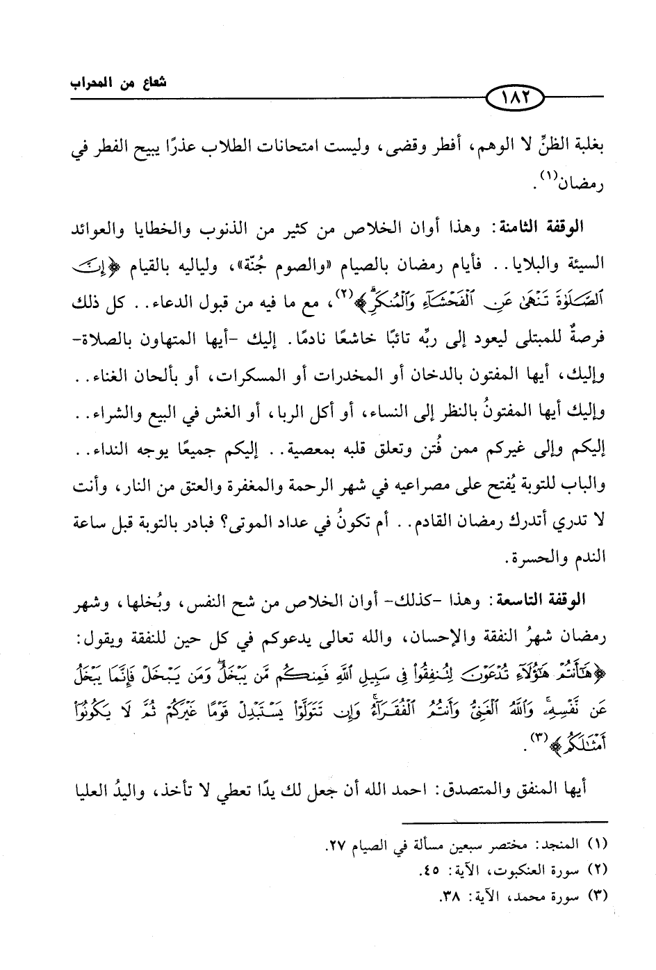 الوقفة الثامنة: وهذا أوان الخلاص من كثير من الذنوب والخطايا والعوائد السيئة والبلايا .. فأيام رمضان بالصيام «والصوم جُنّة»، ولياليه بالقيام {إِنَّ الصَّلَاةَ تَنْهَى عَنِ الْفَحْشَاءِ وَالْمُنْكَرِ} (¬2)، مع ما فيه من قبول الدعاء .. كل ذلك فرصةٌ للمبتلى ليعود إلى ربِّه تائبًا خاشعًا نادمًا. إليك - أيها المتهاون بالصلاة - وإليك، أيها المفتون بالدخان أو المخدرات أو المسكرات، أو بألحان الغناء .. وإليك أيها المفتونُ بالنظر إلى النساء، أو أكل الربا، أو الغش في البيع والشراء .. إليكم وإلى غيركم ممن فُتن وتعلق قلبه بمعصية .. إليكم جميعًا يوجه النداء .. والباب للتوبة يُفتح على مصراعيه في شهر الرحمة والمغفرة والعتق من النار، وأنت لا تدري أتدرك رمضان القادم .. أم تكونُ في عداد الموتى؟ فبادر بالتوبة قبل ساعة الندم والحسرة.