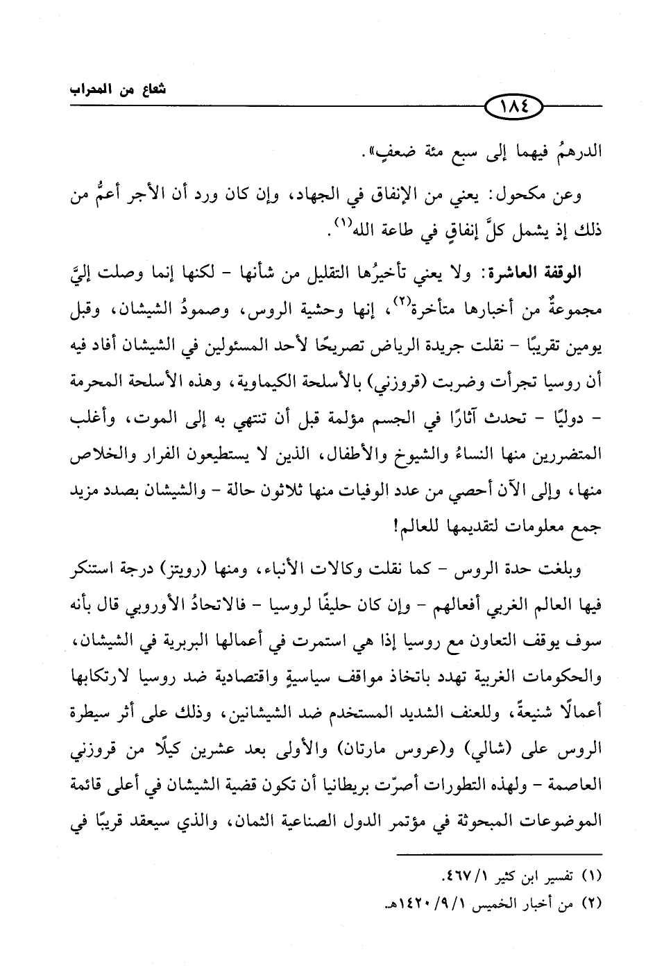 الوقفة العاشرة: ولا يعني تأخيرُها التقليل من شأنها - لكنها إنما وصلت إليَّ مجموعةٌ من أخبارها متأخرة (¬2)، إنها وحشية الروس، وصمودُ الشيشان، وقبل يومين تقريبًا - نقلت جريدة الرياض تصريحًا لأحد المسئولين في الشيشان أفاد فيه أن روسيا تجرأت وضربت (قروزني) بالأسلحة الكيماوية، وهذه الأسلحة المحرمة - دوليًا - تحدث آثارًا في الجسم مؤلمة قبل أن تنتهي به إلى الموت، وأغلب المتضررين منها النساءُ والشيوخ والأطفال، الذين لا يستطيعون الفرار والخلاص منها، وإلى الآن أحصي من عدد الوفيات منها ثلاثون حالة - والشيشان بصدد مزيد جمع معلومات لتقديمها للعالم!