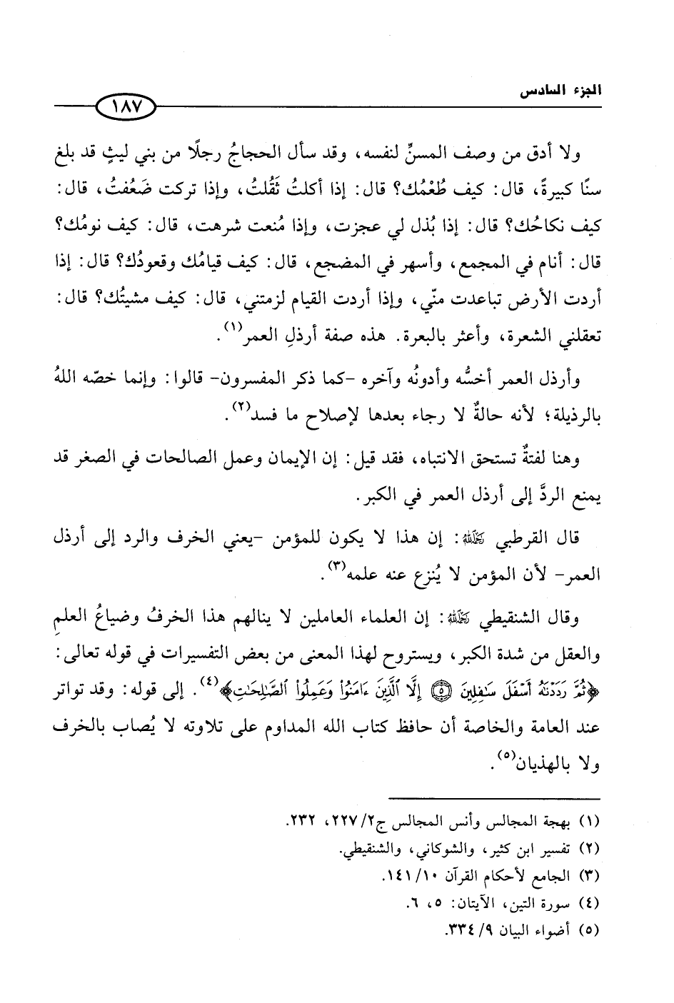 وقال الشنقيطي رحمه الله: إن العلماء العاملين لا ينالهم هذا الخرفُ وضياعُ العلمِ والعقل من شدة الكبر، ويستروح لهذا المعنى من بعض التفسيرات في قوله تعالى: {ثُمَّ رَدَدْنَاهُ أَسْفَلَ سَافِلِينَ (5) إِلَّا الَّذِينَ آمَنُوا وَعَمِلُوا الصَّالِحَاتِ} (¬4). إلى قوله: وقد تواتر عند العامة والخاصة أن حافظ كتاب الله المداوم على تلاوته لا يُصاب بالخرف ولا بالهذيان (¬5).