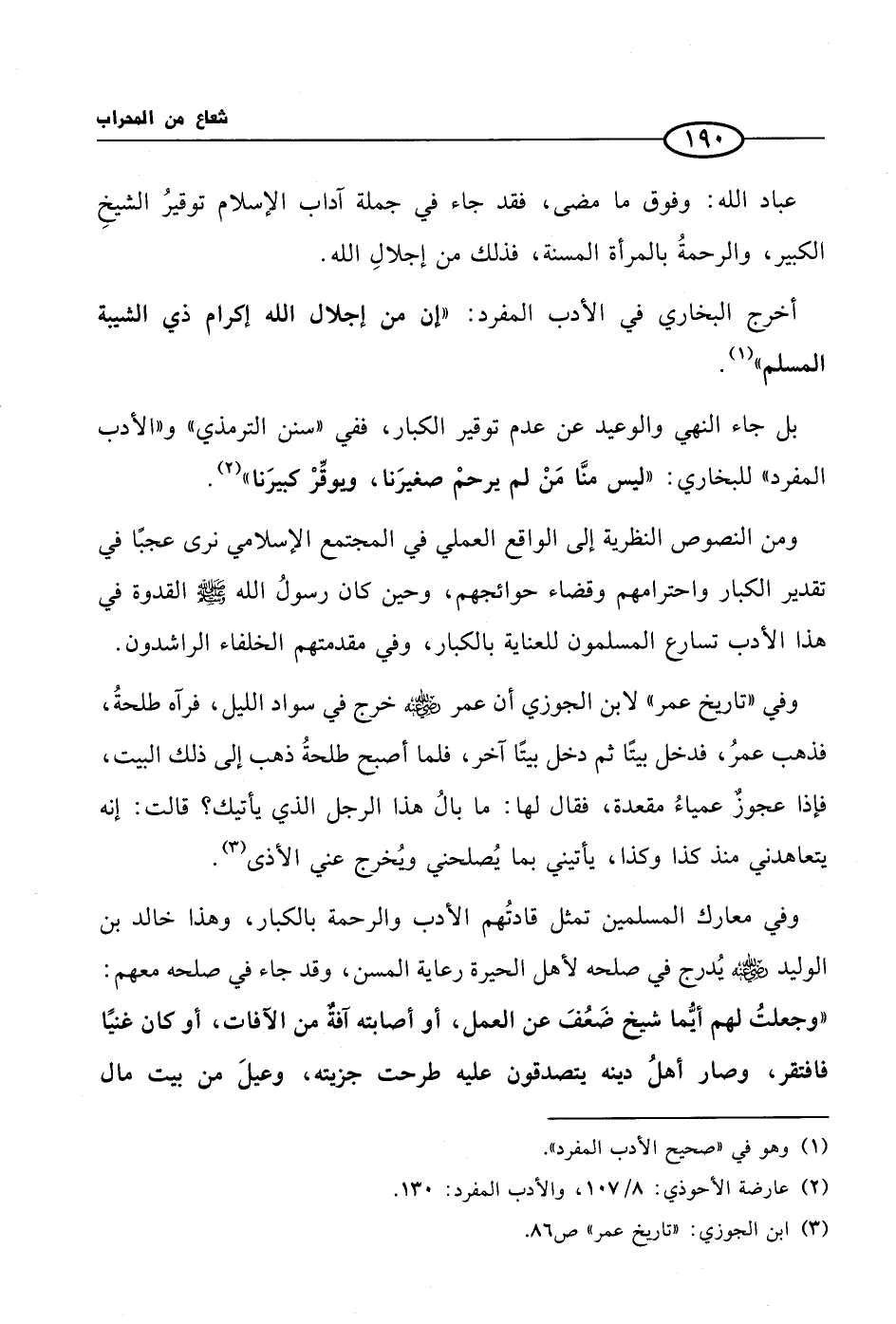 بل جاء النهي والوعيد عن عدم توقير الكبار، ففي «سنن الترمذي» و «الأدب المفرد» للبخاري: «ليس منَّا مَنْ لم يرحمْ صغيرَنا، ويوقِّرْ كبيرَنا» (¬2).