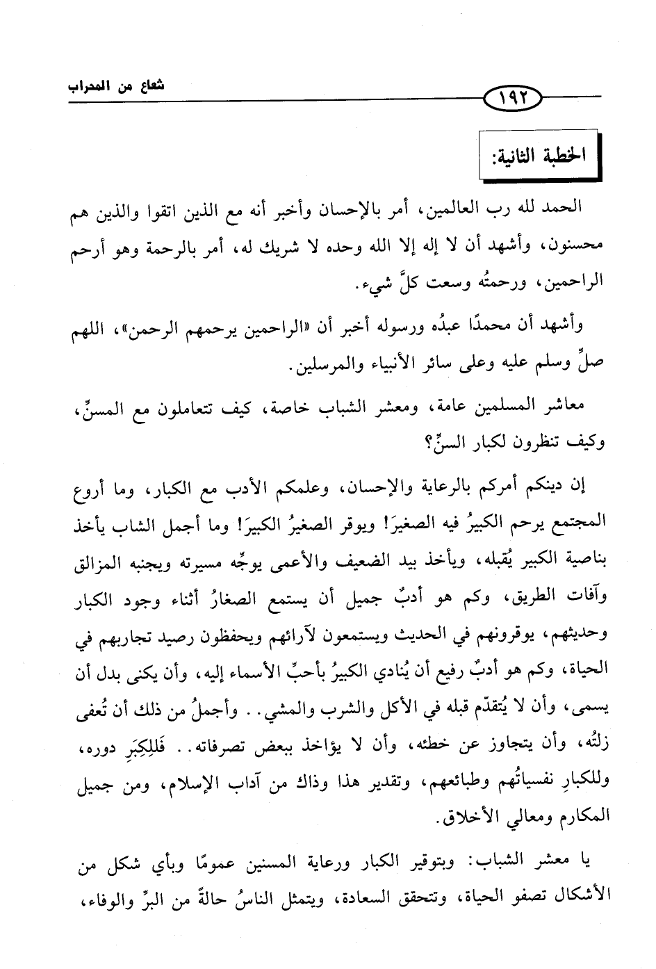 يا معشر الشباب: وبتوقير الكبار ورعاية المسنين عمومًا وبأي شكل من الأشكال تصفو الحياة، وتتحقق السعادة، ويتمثل الناسُ حالةً من البرِّ والوفاء،