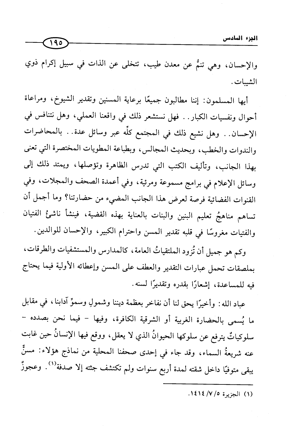 أيها المسلمون: إننا مطالبون جميعًا برعاية المسنين وتقدير الشيوخ، ومراعاة أحوال ونفسيات الكبار .. فهل نستشعر ذلك في واقعنا العملي، وهل نتنافس في الإحسان .. وهل نشيع ذلك في المجتمع كلِّه عبر وسائل عدة .. بالمحاضرات والندوات والخطب، وبحديث المجالس، وبطباعة المطويات المختصرة التي تعنى بهذا الجانب، وتأليف الكتب التي تدرس الظاهرة وتؤصلها، ويمتد ذلك إلى وسائل الإعلام في برامج مسموعة ومرئية، وفي أعمدة الصحف والمجلات، وفي القنوات الفضائية فرصة لعرض هذا الجانب المضيء من حضارتنا؟ وما أجمل أن تساهم مناهجُ تعليم البنين والبنات بالعناية بهذه القضية، فينشأ ناشئُ الفتيان والفتيات مغروسًا في قلبه تقدير المسن واحترام الكبير، والإحسان للوالدين.