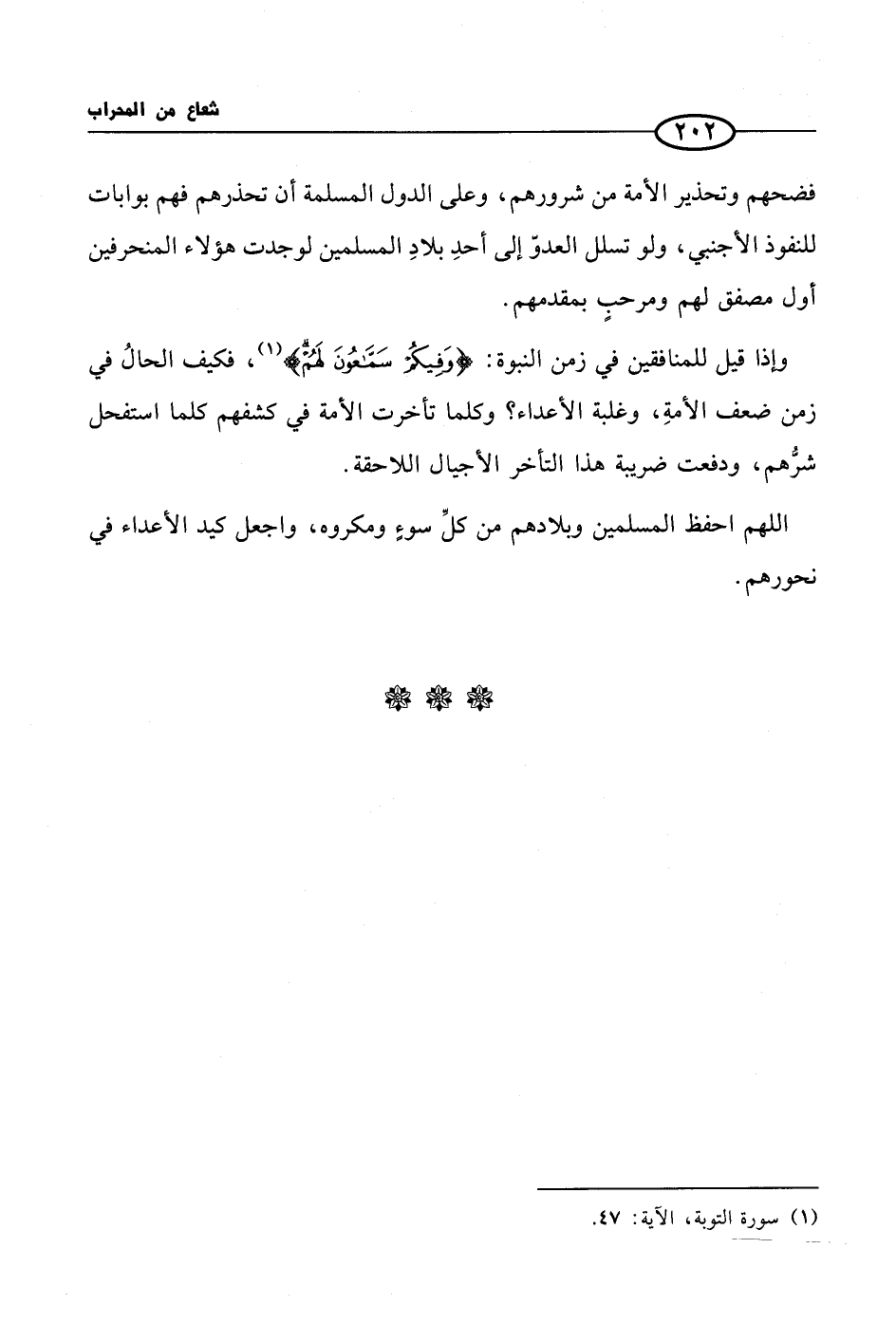فضحهم وتحذير الأمة من شرورهم، وعلى الدول المسلمة أن تحذرهم فهم بوابات للنفوذ الأجنبي، ولو تسلل العدوّ إلى أحدِ بلادِ المسلمين لوجدت هؤلاء المنحرفين أول مصفق لهم ومرحبٍ بمقدمهم.