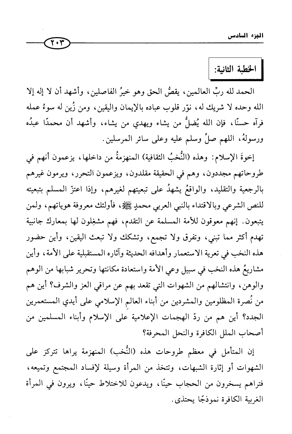 إخوةَ الإسلام: وهذه (النُّخبُ الثقافية) المنهزمةُ من داخلها، يزعمون أنهم في طروحاتهم مجددون، وهم في الحقيقة مقلدون، ويزعمون التحرر، ويرمون غيرهم بالرجعية والتقليد، والواقعُ يشهدُ على تبعيتهم لغيرهم، وإذا اعتزّ المسلم بتبعيته للنص الشرعي وبالاقتداء بالنبي العربي محمدٍ صلى الله عليه وسلم، فأولئك معروفة هوياتهم، ولمن يتبعون. إنهم معوقون للأمة المسلمة عن التقدم، فهم مشغِلون لها بمعارك جانبية تهدم أكثر مما تبني، وتفرق ولا تجمع، وتشكك ولا تبعث اليقين، وأين حضور هذه النخب في تعرية الاستعمار وأهدافه الحديثة وآثاره المستقبلية على الأمة، وأين مشاريعُ هذه النخب في سبيل وعي الأمة واستعادة مكانتها وتحرير شبابها من الوهم والوهن، وانتشالهم من الشهوات التي تقعد بهم عن مراقي العز والشرف؟ أين هم من نُصرة المظلومين والمشردين من أبناء العالمِ الإسلامي على أيدي المستعمرين الجدد؟ أين هم من ردّ الهجمات الإعلامية على الإسلام وأبناء المسلمين من أصحاب الملل الكافرة والنحل المحرفة؟