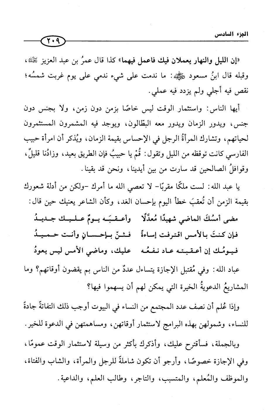 أيها الناس: واستثمار الوقت ليس خاصًا بزمن دون زمن، ولا بجنس دون جنس، ويدور الزمان ويدور معه البطّالون، ويوجد فيه المشمرون المستثمرون لحياتهم، وتشارك المرأةُ الرجل في الإحساس بقيمة الزمان، ويُذكر أن امرأة حبيب الفارسي كانت توقظه من الليل وتقول: قُمْ يا حبيبُ فإن الطريق بعيد، وزادُنا قليلٌ، وقوافلُ الصالحين قد سارت من بين أيدينا، ونحن قد بقينا.