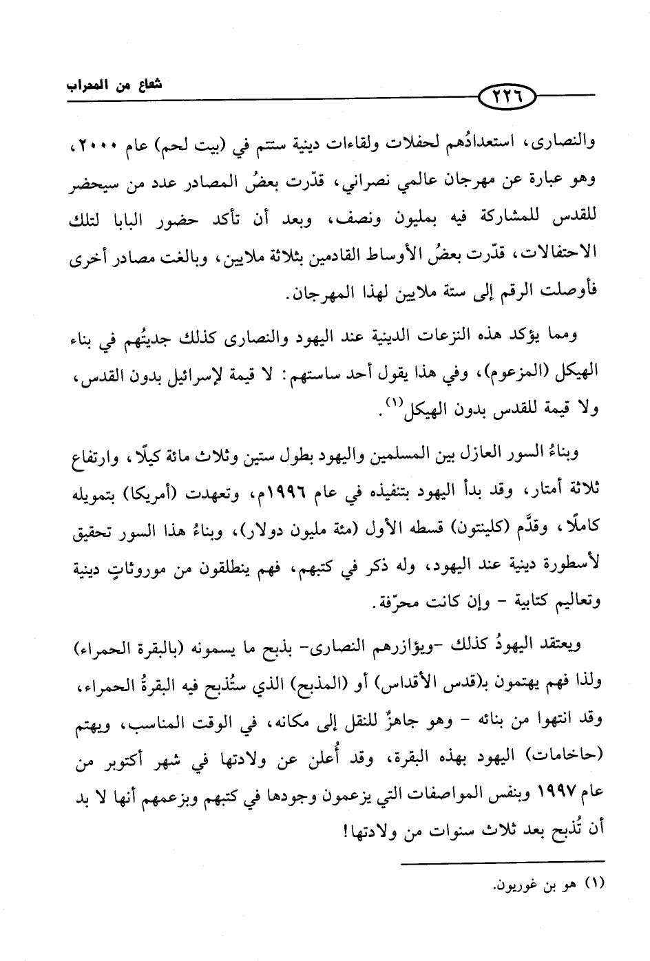 ومما يؤكد هذه النزعات الدينية عند اليهود والنصارى كذلك جديتُهم في بناء الهيكل (المزعوم)، وفي هذا يقول أحد ساستهم: لا قيمة لإسرائيل بدون القدس، ولا قيمة للقدس بدون الهيكل (¬1).