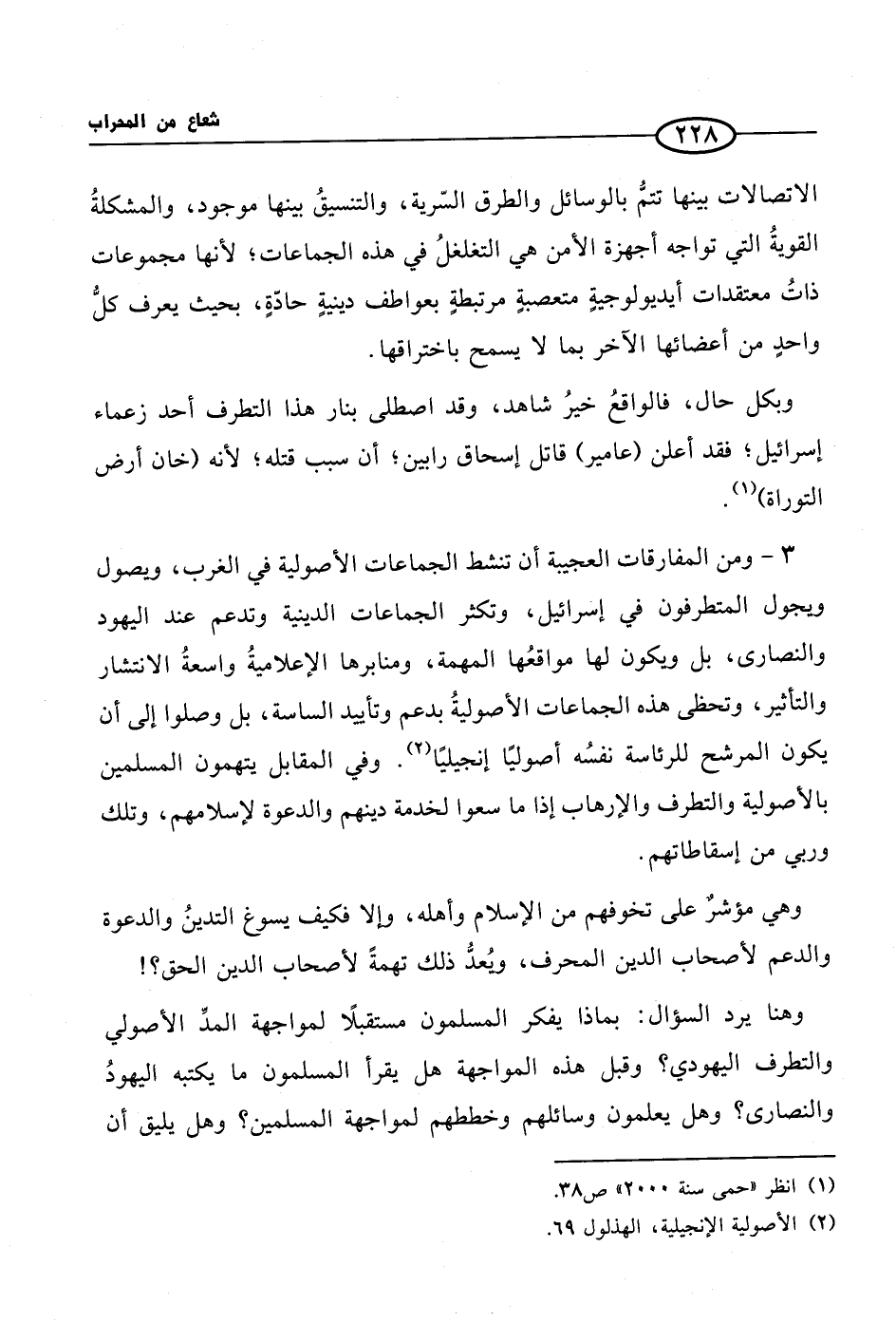وهنا يرد السؤال: بماذا يفكر المسلمون مستقبلًا لمواجهة المدِّ الأصولي والتطرف اليهودي؟ وقبل هذه المواجهة هل يقرأ المسلمون ما يكتبه اليهودُ والنصارى؟ وهل يعلمون وسائلهم وخططهم لمواجهة المسلمين؟ وهل يليق أن