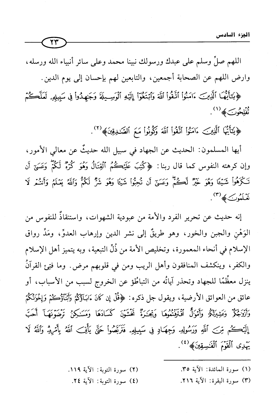 أيها المسلمون: الحديث عن الجهاد في سبيل الله حديثٌ عن معالي الأمور، وإن كرهته النفوس كما قال ربنا: {كُتِبَ عَلَيْكُمُ الْقِتَالُ وَهُوَ كُرْهٌ لَّكُمْ وَعَسَى أَن تَكْرَهُوا شَيْئًا وَهُوَ خَيْرٌ لَّكُمْ وَعَسَى أَن تُحِبُّوا شَيْئًا وَهُوَ شَرٌّ لَّكُمْ وَاللَّهُ يَعْلَمُ وَأَنتُمْ لاَ تَعْلَمُونَ} (¬3).