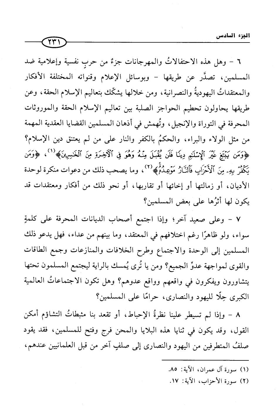 6 - وهل هذه الاحتفالاتُ والمهرجانات جزءٌ من حربٍ نفسية وإعلامية ضد المسلمين، تصدَّر عن طريقها - وبوسائل الإعلام وقنواته المختلفة الأفكار والمعتقداتُ اليهوديةُ والنصرانية، ومن خلالها يشكّك بتعاليم الإسلام الحقة، وعن طريقها يحاولون تحطيم الحواجز الصلبة بين تعاليم الإسلام الحقة والموروثات المحرفة في التوراة والإنجيل، وتُهمش في أذهان المسلمين القضايا العقدية المهمة من مثل الولاء والبراء، والحكمُ بالكفر والنار على من لم يعتنق دين الإسلام؟ {وَمَنْ يَبْتَغِ غَيْرَ الْإِسْلَامِ دِينًا فَلَنْ يُقْبَلَ مِنْهُ وَهُوَ فِي الْآخِرَةِ مِنَ الْخَاسِرِينَ} (¬1)، {وَمَنْ يَكْفُرْ بِهِ مِنَ الْأَحْزَابِ فَالنَّارُ مَوْعِدُهُ} (¬2)، وما يصحب ذلك من دعوات منكرة لوحدة الأديان، أو زمالتها أو إخائها أو تقاربها، أو نحو ذلك من أفكار ومعتقدات قد يكون لها أثرُها على بعض المسلمين؟
