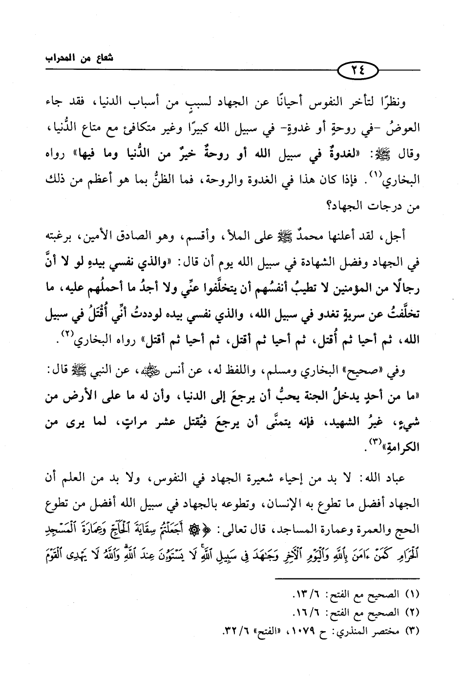 ونظرًا لتأخر النفوس أحيانًا عن الجهاد لسببٍ من أسباب الدنيا، فقد جاء العوضُ - في روحةٍ أو غدوةٍ - في سبيل الله كبيرًا وغير متكافئ مع متاع الدُّنيا، وقال صلى الله عليه وسلم: «لغدوةٌ في سبيل الله أو روحةٌ خيرٌ من الدُّنيا وما فيها» رواه البخاري (¬1). فإذا كان هذا في الغدوة والروحة، فما الظنُّ بما هو أعظم من ذلك من درجات الجهاد؟