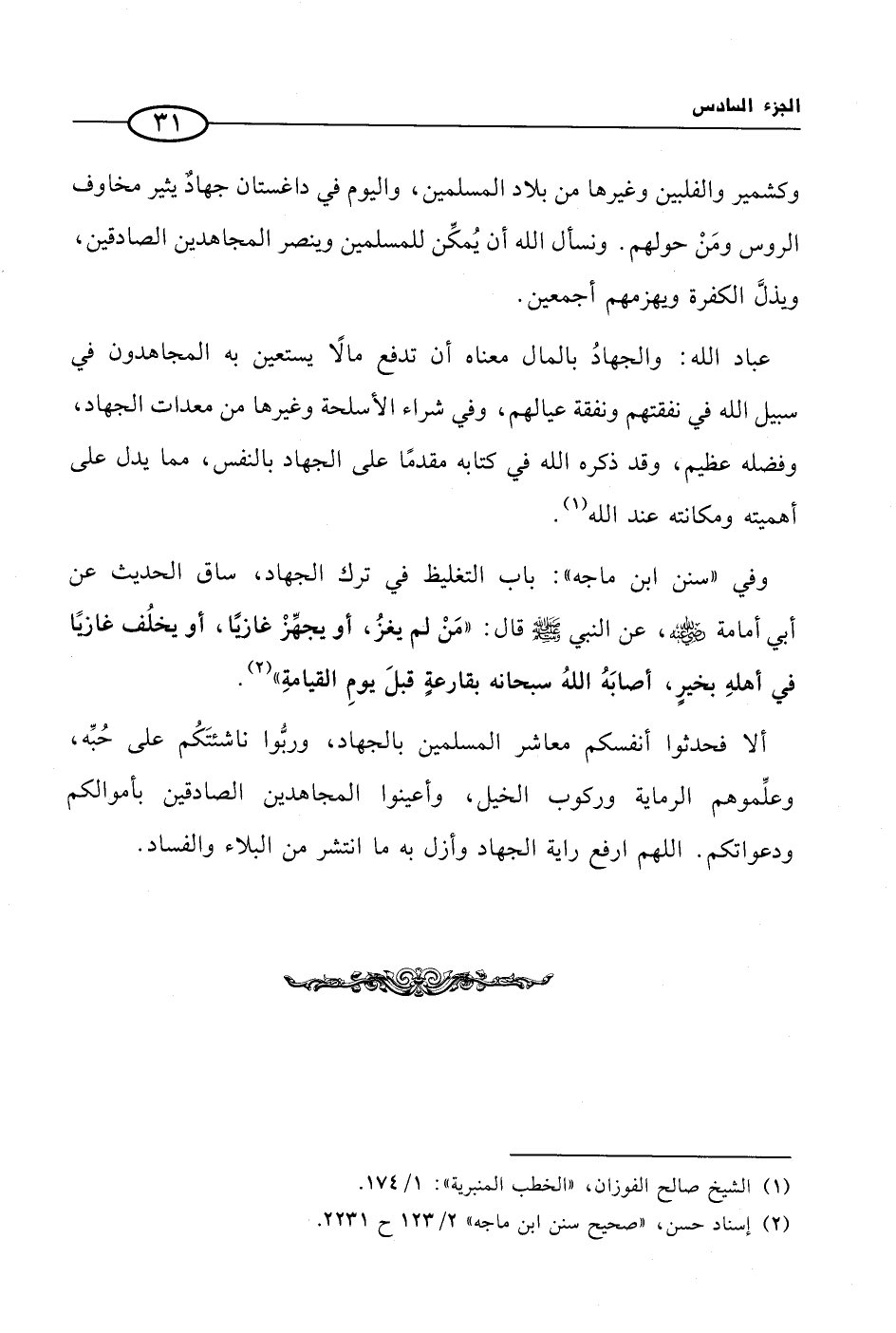 ألا فحدثوا أنفسكم معاشر المسلمين بالجهاد، وربُّوا ناشئتَكُم على حُبِّه، وعلِّموهم الرماية وركوب الخيل، وأعينوا المجاهدين الصادقين بأموالكم ودعواتكم. اللهم ارفع راية الجهاد وأزل به ما انتشر من البلاء والفساد.