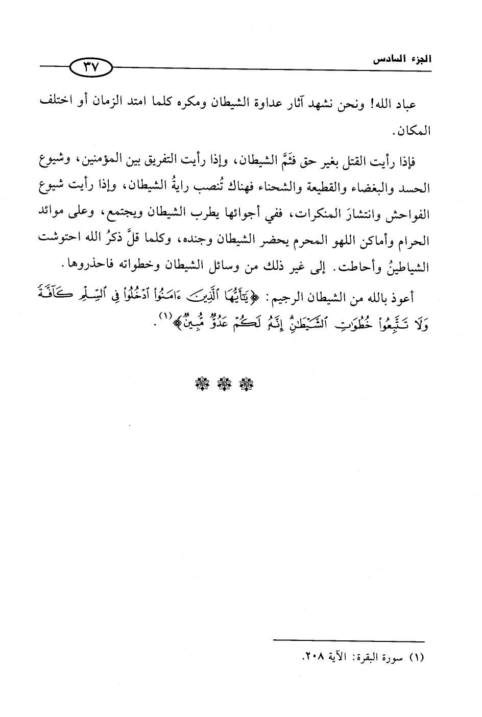 أعوذ بالله من الشيطان الرجيم: {يَا أَيُّهَا الَّذِينَ آمَنُوا ادْخُلُوا فِي السِّلْمِ كَآفَّةً وَلاَ تَتَّبِعُوا خُطُوَاتِ الشَّيْطَانِ إِنَّهُ لَكُمْ عَدُوٌّ مُّبِينٌ (208)} (¬1).