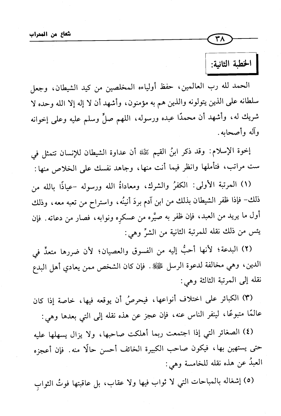 إخوة الإسلام: وقد ذكر ابنُ القيم -رحمه الله - أن عداوة الشيطان للإنسان تتمثل في ست مراتب، فتأملها وانظر فيما أنت منها، وجاهد نفسك على الخلاص منها: