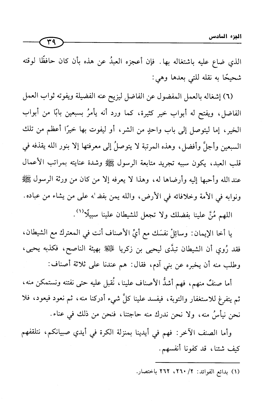 (6) إشغاله بالعمل المفضول عن الفاضل ليزيح عنه الفضيلة ويفوته ثواب العمل الفاضل، ويفتح له أبواب خير كثيرة، كما ورد أنه يأمرُ بسبعين بابًا من أبواب الخير، إما ليتوصل إلى باب واحدٍ من الشر، أو ليفوت بها خيرًا أعظم من تلك السبعين وأجلَّ وأفضل، وهذه المرتبة لا يتوصلُ إلى معرفتها إلا بنور الله يقذفه في قلب العبد، يكون سببه تجريد متابعة الرسول صلى الله عليه وسلم وشدة عنايته بمراتب الأعمال عند الله وأحبها إليه وأرضاها له، وهذا لا يعرفه إلا من كان من ورثة الرسول صلى الله عليه وسلم ونوابه في الأمة وخلافئه في الأرض، والله يمن بفضله على من يشاء من عباده.