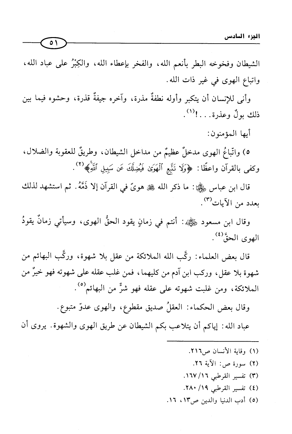 5) واتّباعُ الهوى مدخلٌ عظيمٌ من مداخل الشيطان، وطريقٌ للعقوبة والضلال، وكفى بالقرآن واعظًا: {وَلا تَتَّبِعِ الْهَوَى فَيُضِلَّكَ عَن سَبِيلِ اللَّهِ} (¬2). قال ابن عباس رضي الله عنهما: ما ذكر الله عز وجل هوىً في القرآن إلا ذَمَّهُ. ثم استشهد لذلك بعدد من الآيات (¬3).