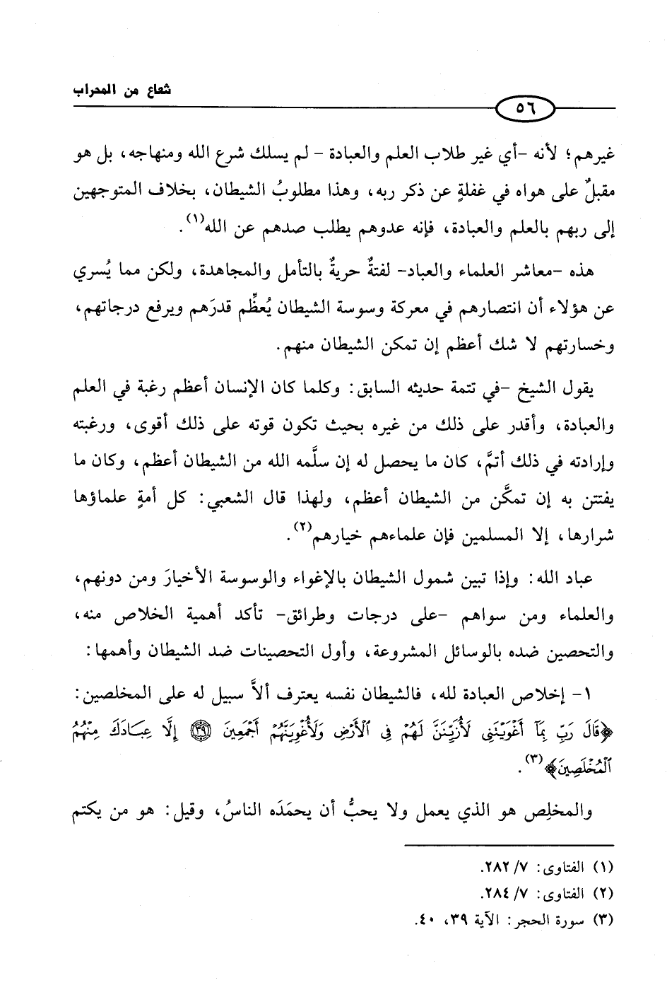وكلما كان الإنسان أعظم رغبة في العلم والعبادة، وأقدر على ذلك من غيره بحيث تكون قوته على ذلك أقوى، ورغبته وإرادته في ذلك أتمَّ، كان ما يحصل له إن سلَّمه الله من الشيطان أعظم، وكان ما يفتتن به إن تمكَّن من الشيطان أعظم، ولهذا قال الشعبي: كل أمةٍ علماؤها شرارها، إلا المسلمين فإن علماءهم خيارهم (¬2).