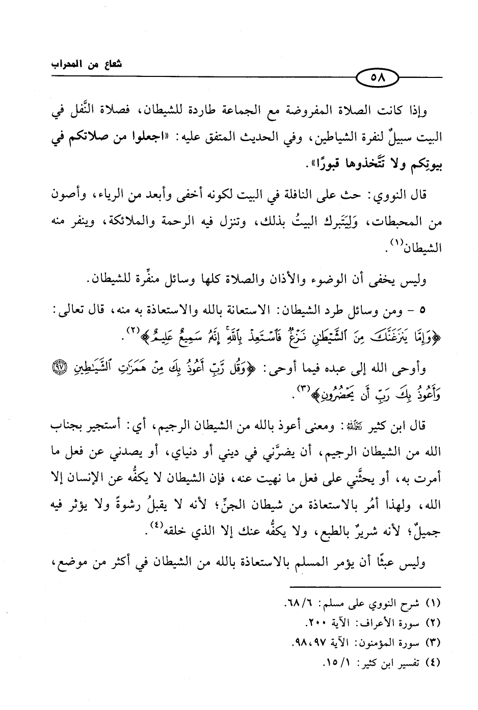 وإذا كانت الصلاة المفروضة مع الجماعة طاردة للشيطان، فصلاة النَّفل في البيت سبيلٌ لنفرة الشياطين، وفي الحديث المتفق عليه: «اجعلوا من صلاتكم في بيوتِكم ولا تَتَّخذوها قبورًا».