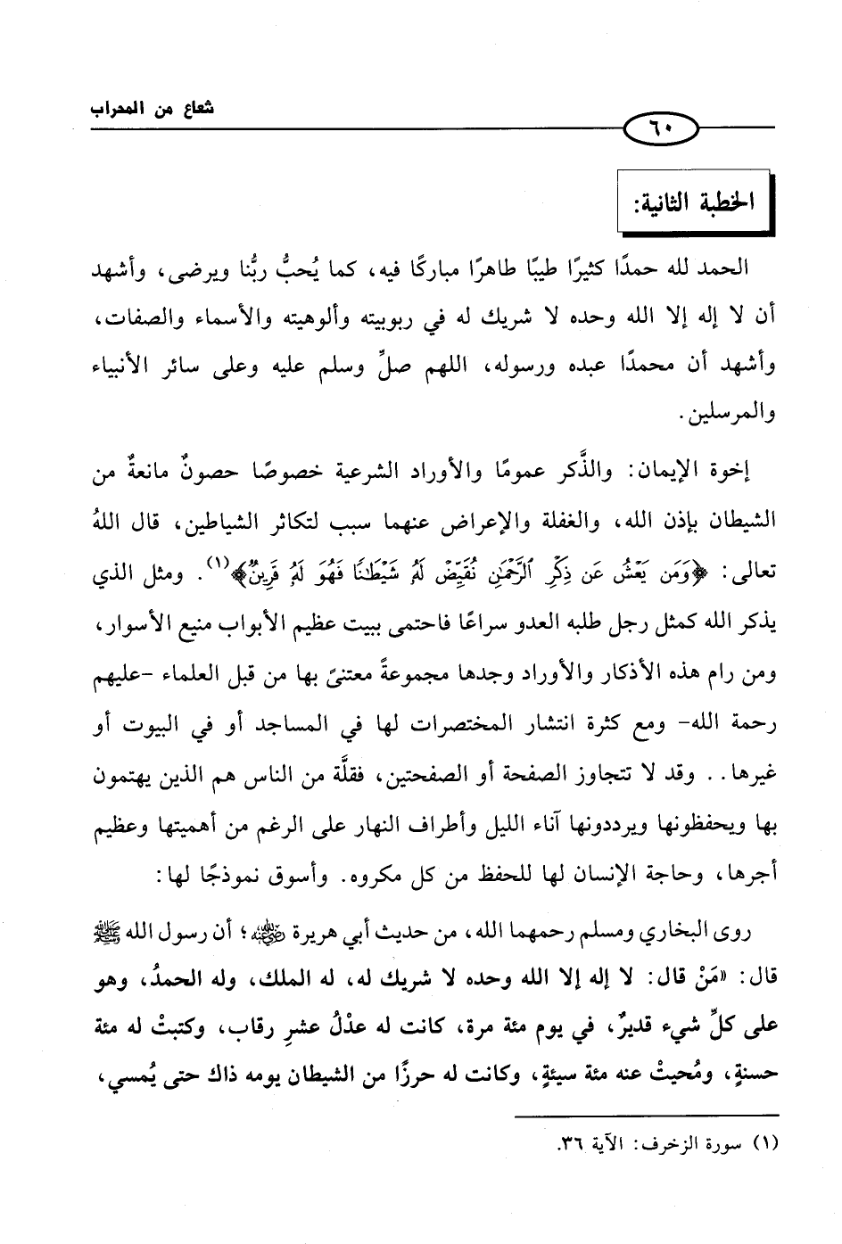 إخوة الإيمان: والذَّكر عمومًا والأوراد الشرعية خصوصًا حصونٌ مانعةٌ من الشيطان بإذن الله، والغفلة والإعراض عنهما سبب لتكاثر الشياطين، قال اللهُ تعالى: {وَمَن يَعْشُ عَن ذِكْرِ الرَّحْمَنِ نُقَيِّضْ لَهُ شَيْطَانًا فَهُوَ لَهُ قَرِينٌ} (¬1). ومثل الذي يذكر الله كمثل رجل طلبه العدو سراعًا فاحتمى ببيت عظيم الأبواب منيع الأسوار، ومن رام هذه الأذكار والأوراد وجدها مجموعةً معتنىً بها من قبل العلماء -عليهم رحمة الله - ومع كثرة انتشار المختصرات لها في المساجد أو في البيوت أو غيرها .. وقد لا تتجاوز الصفحة أو الصفحتين، فقلَّة من الناس هم الذين يهتمون بها ويحفظونها ويرددونها آناء الليل وأطراف النهار على الرغم من أهميتها وعظيم أجرها، وحاجة الإنسان لها للحفظ من كل مكروه. وأسوق نموذجًا لها: