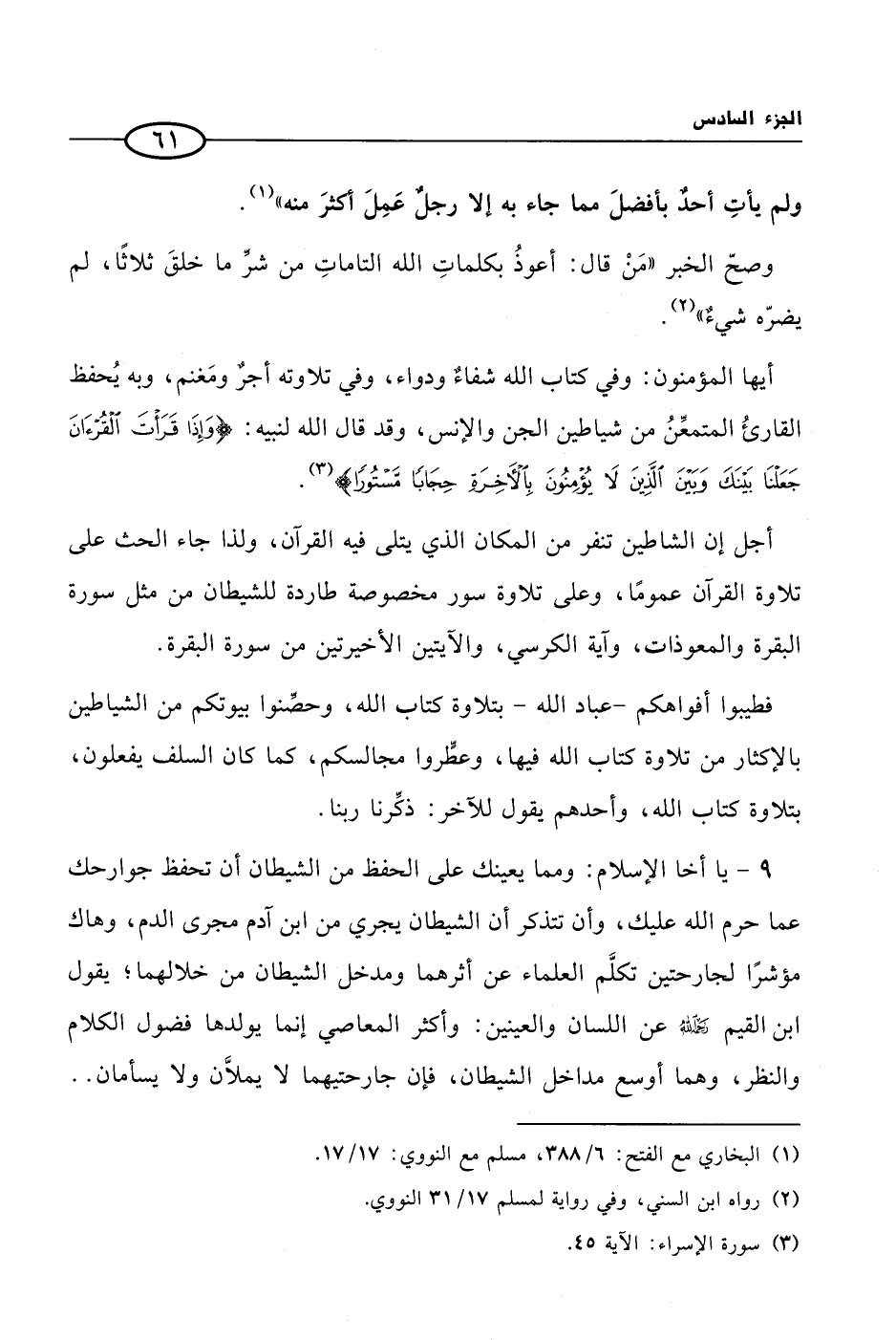 ولم يأتِ أحدٌ بأفضلَ مما جاء به إلا رجلٌ عَمِلَ أكثرَ منه» (¬1). وصحّ الخبر «مَنْ قال: أعوذُ بكلماتِ الله التاماتِ من شرِّ ما خلقَ ثلاثًا، لم يضرّه شيءٌ» (¬2).