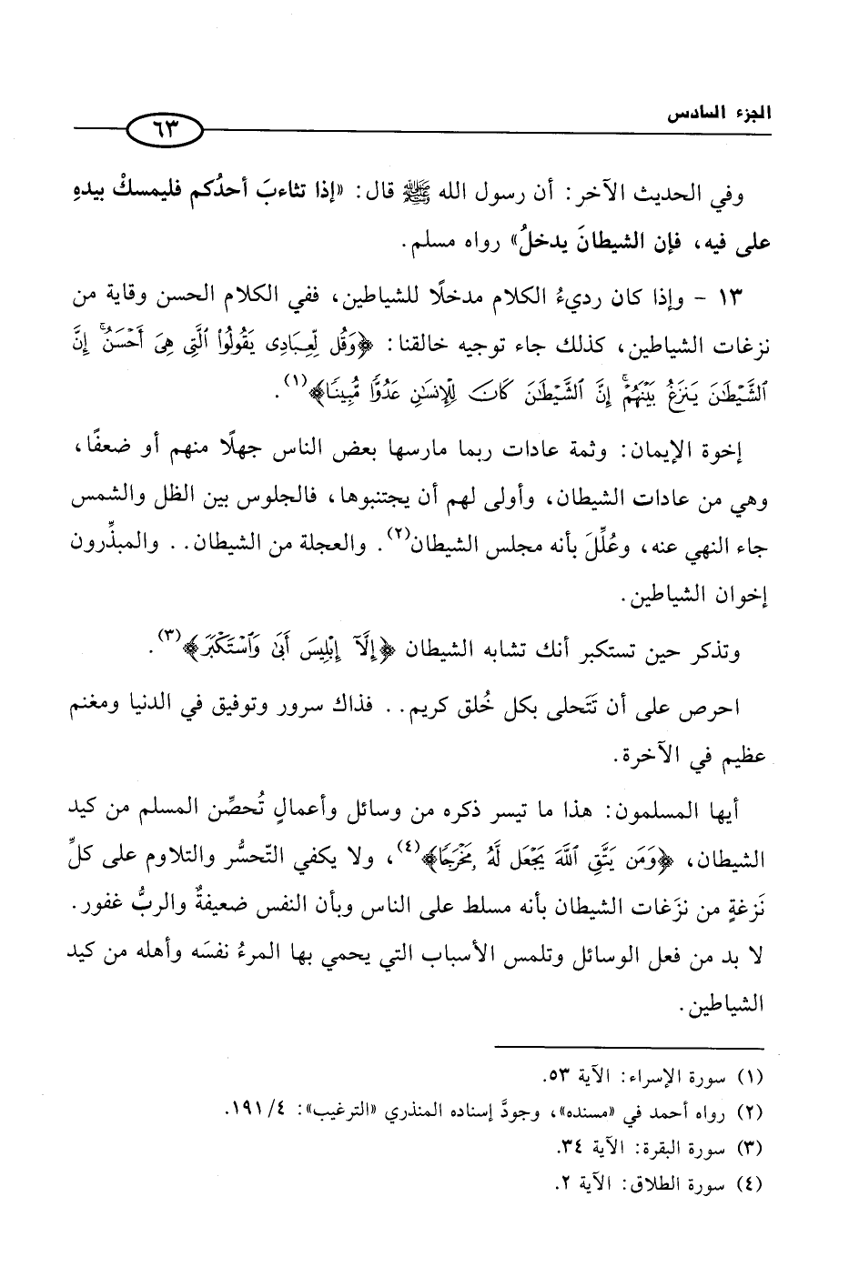 13 - وإذا كان رديءُ الكلام مدخلًا للشياطين، ففي الكلام الحسن وقاية من نزغات الشياطين، كذلك جاء توجيه خالقنا: {وَقُل لِّعِبَادِي يَقُولُوا الَّتِي هِيَ أَحْسَنُ إِنَّ الشَّيْطَانَ يَنزَغُ بَيْنَهُمْ إِنَّ الشَّيْطَانَ كَانَ لِلإِنْسَانِ عَدُوًّا مُّبِينًا} (¬1).