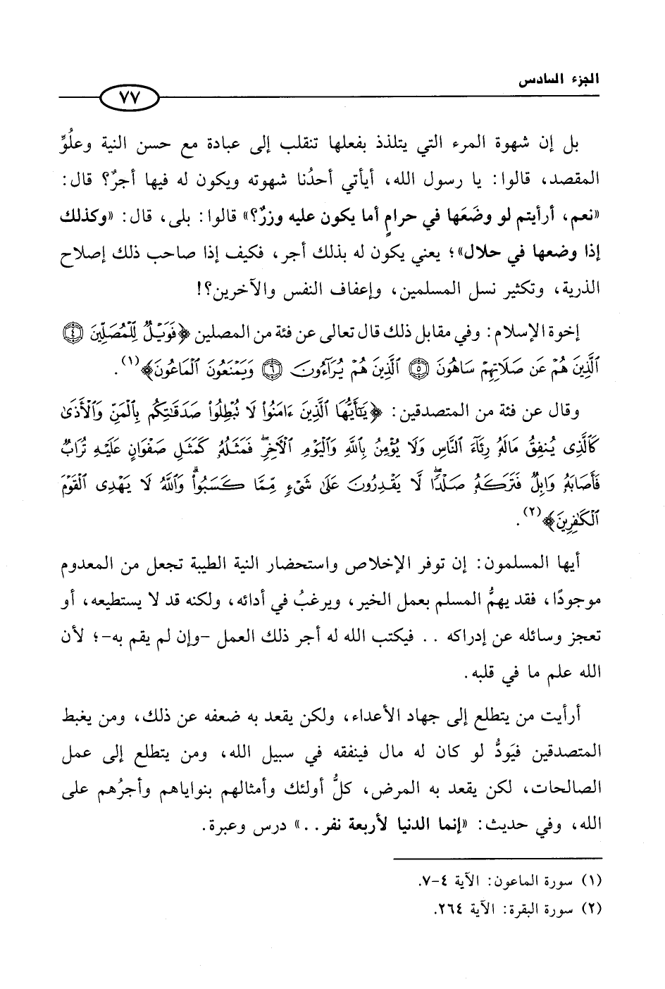 أرأيت من يتطلع إلى جهاد الأعداء، ولكن يقعد به ضعفه عن ذلك، ومن يغبط المتصدقين فيَودُّ لو كان له مال فينفقه في سبيل الله، ومن يتطلع إلى عمل الصالحات، لكن يقعد به المرض، كلُّ أولئك وأمثالهم بنواياهم وأجرُهم على الله، وفي حديث: «إنما الدنيا لأربعة نفر .. » درس وعبرة.