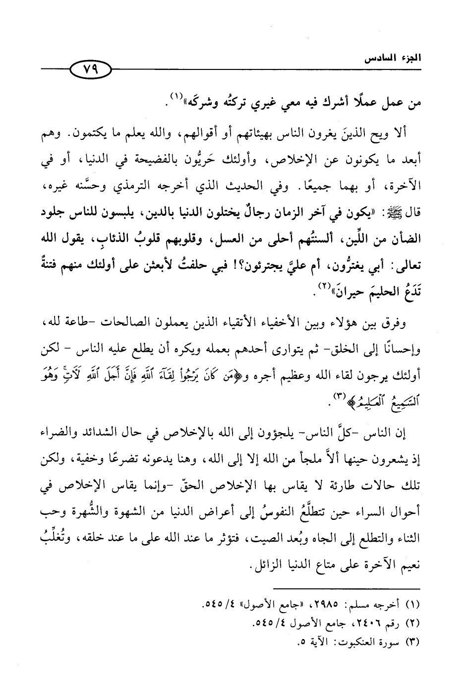 وفرق بين هؤلاء وبين الأخفياء الأتقياء الذين يعملون الصالحات -طاعة لله، وإحسانًا إلى الخلق - ثم يتوارى أحدهم بعمله ويكره أن يطلع عليه الناس - لكن أولئك يرجون لقاء الله وعظيم أجره و {مَن كَانَ يَرْجُو لِقَاءَ اللَّهِ فَإِنَّ أَجَلَ اللَّهِ لآتٍ وَهُوَ السَّمِيعُ الْعَلِيمُ} (¬3).