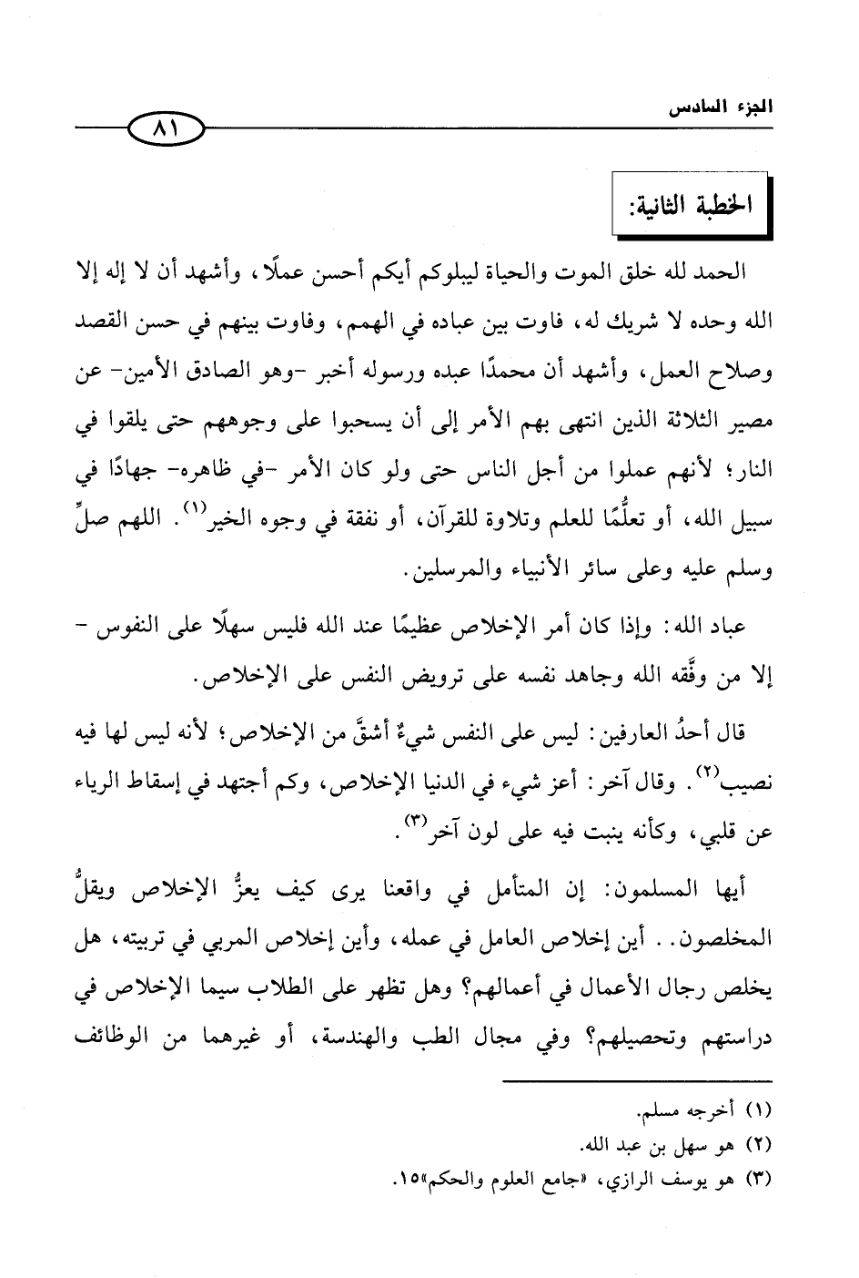 الحمد لله خلق الموت والحياة ليبلوكم أيكم أحسن عملًا، وأشهد أن لا إله إلا الله وحده لا شريك له، فاوت بين عباده في الهمم، وفاوت بينهم في حسن القصد وصلاح العمل، وأشهد أن محمدًا عبده ورسوله أخبر -وهو الصادق الأمين - عن مصير الثلاثة الذين انتهى بهم الأمر إلى أن يسحبوا على وجوههم حتى يلقوا في النار؛ لأنهم عملوا من أجل الناس حتى ولو كان الأمر -في ظاهره - جهادًا في سبيل الله، أو تعلُّمًا للعلم وتلاوة للقرآن، أو نفقة في وجوه الخير (¬1). اللهم صلِّ وسلم عليه وعلى سائر الأنبياء والمرسلين.