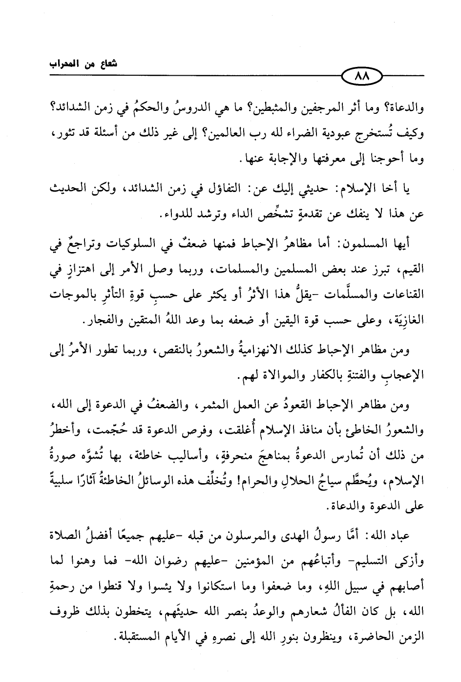 ومن مظاهر الإحباط القعودُ عن العمل المثمر، والضعفُ في الدعوة إلى الله، والشعورُ الخاطئ بأن منافذ الإسلام أُغلقت، وفرص الدعوة قد حُجّمت، وأخطرُ من ذلك أن تُمارس الدعوةُ بمناهجَ منحرفةٍ، وأساليب خاطئة، بها تُشوَّه صورةُ الإسلام، ويُحطَّم سياجُ الحلالِ والحرام! وتُخلِّف هذه الوسائلُ الخاطئةُ آثارًا سلبيةً على الدعوة والدعاة.