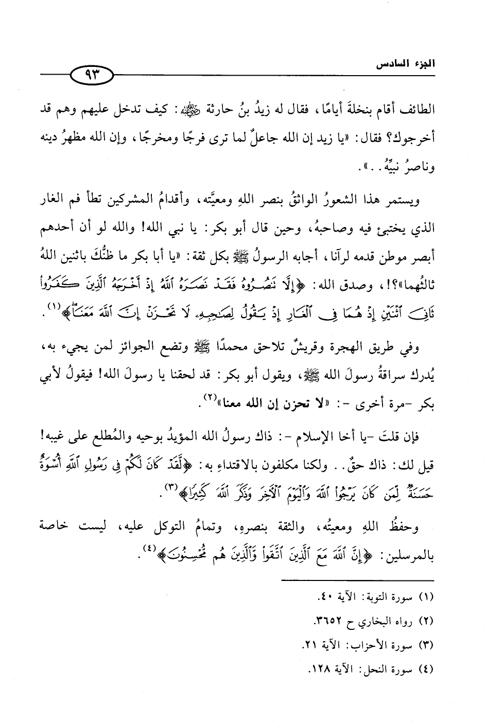 وفي طريق الهجرة وقريشٌ تلاحق محمدًا صلى الله عليه وسلم وتضع الجوائز لمن يجيء به، يُدرك سراقةُ رسولَ الله صلى الله عليه وسلم، ويقول أبو بكر: قد لحقنا يا رسولَ الله! فيقولُ لأبي بكر -مرة أخرى -: «لا تحزن إن الله معنا» (¬3).