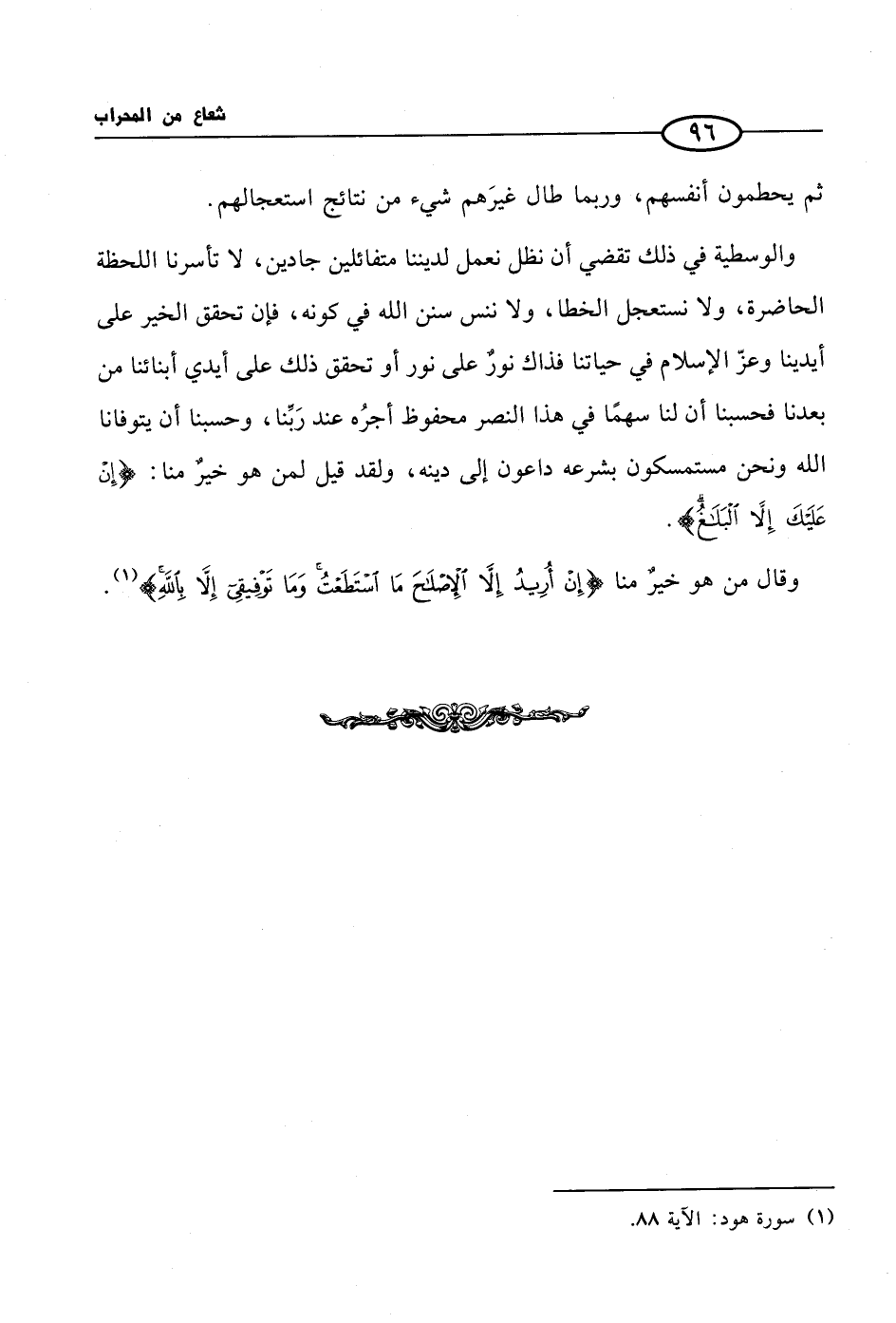 والوسطية في ذلك تقضي أن نظل نعمل لديننا متفائلين جادين، لا تأسرنا اللحظة الحاضرة، ولا نستعجل الخطا، ولا ننس سنن الله في كونه، فإن تحقق الخير على أيدينا وعزّ الإسلام في حياتنا فذاك نورٌ على نور أو تحقق ذلك على أيدي أبنائنا من بعدنا فحسبنا أن لنا سهمًا في هذا النصر محفوظ أجرُه عند رَبِّنا، وحسبنا أن يتوفانا الله ونحن مستمسكون بشرعه داعون إلى دينه، ولقد قيل لمن هو خيرٌ منا: «إن عليك إلا البلاغ».
