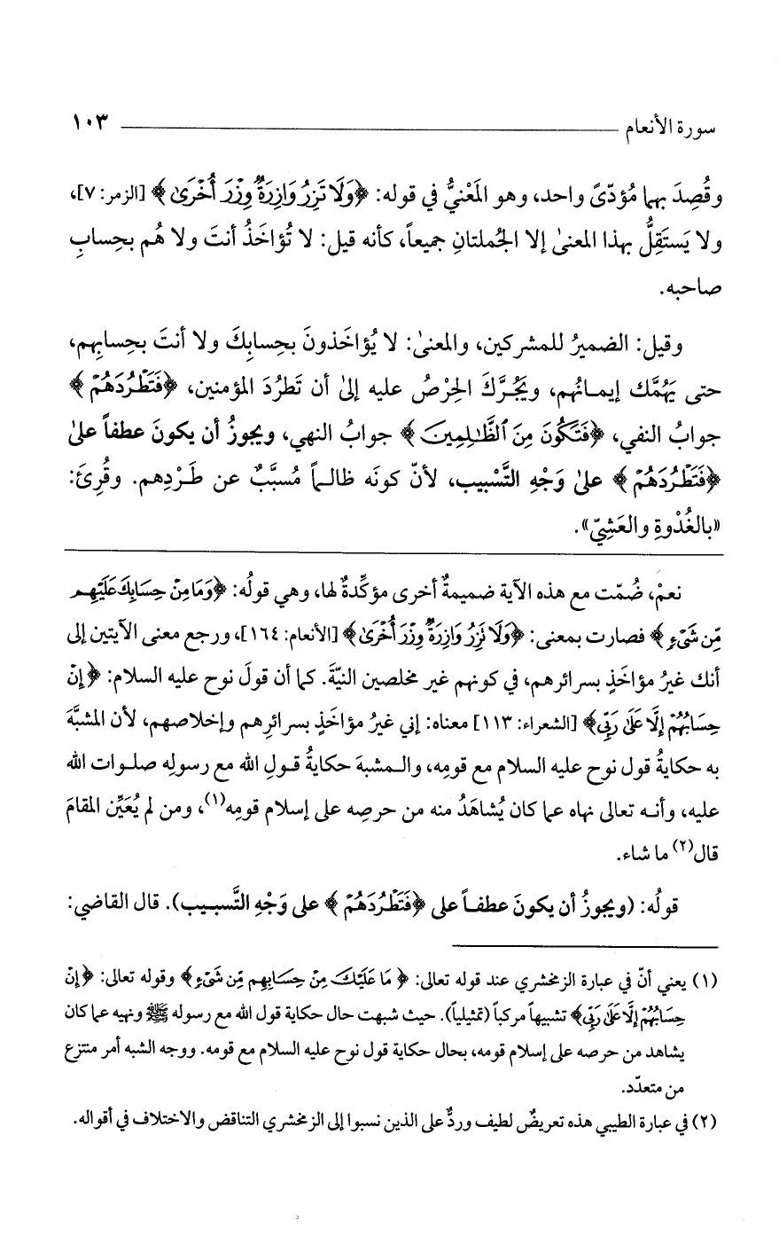 نعم، ضمت مع هذه الآية ضميمة أخرى مؤكدة لها، وهي قوله: {ومَا مِنْ حِسَابِكَ عَلَيْهِم مِّن شَيْءٍ {فصارت بمعنى: {ولا تَزِرُ وازِرَةٌ وزْرَ أُخْرَى {[الأنعام: 164]، ورجع معنى الآيتين إلى أنك غير مؤاخذٍ بسرائرهم، في كونهم غير مخلصين النية. كما أن قول نوح عليه السلام: {إنْ حِسَابُهُمْ إلاَّ عَلَى رَبِّي {[الشعراء: 113] معناه: إني غير مؤاخذٍ بسرائرهم وإخلاصهم، لأن المشبه به حكاية قول نوح عليه السلام مع قومه، والمشبه حكاية قول الله مع رسوله صلوات الله عليه، وأنه تعالى نهاه عما كان يشاهد منه من حرصه على إسلام قومه، ومن لم يعين المقام قال ما شاء.