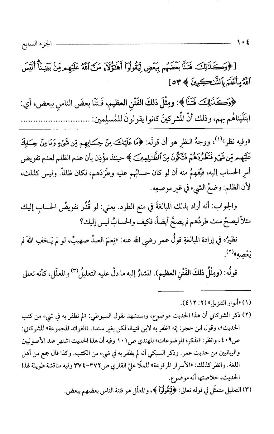 "وفيه نظر"، ووجه النظر هو أن قوله: {مَا عَلَيْكَ مِنْ حِسَابِهِم مِّن شَيْءٍ ومَا مِنْ حِسَابِكَ عَلَيْهِم مِّن شَيْءٍ فَتَطْرُدَهُمْ فَتَكُونَ مَنَ الظَّالِمِينَ {حينئذ مؤذن بأن عدم الظلم لعدم تفويض أمر الحساب إليه، فيفهم منه أن لو كان حسابهم عليه وطردهم، لكان ظالماً. وليس كذلك، لأن الظلم: وضع الشيء في غير موضعه.