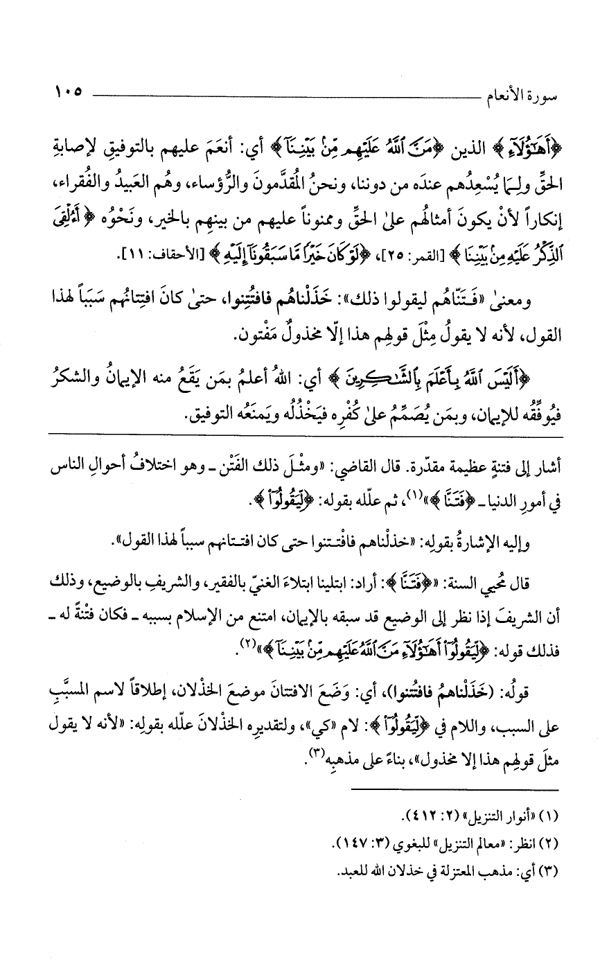 قوله: (خذلناهم فافتتنوا)، أي: وضع الافتتان موضع الخذلان، إطلاقاً لاسم المسبب على السبب، واللام في {لِيَقُولُوا {: لام "كي"، ولتقديره الخذلان علله بقوله: "لأنه لا يقول مثل قولهم هذا إلا مخذول"، بناءً على مذهبه.