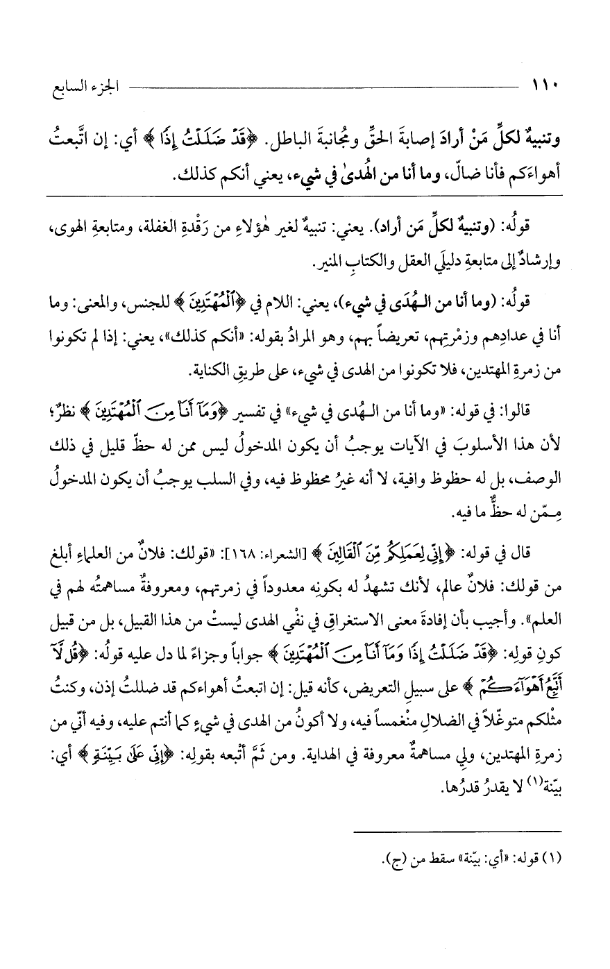 قال في قوله: (إنِّي لِعَمَلِكُم مِّنَ القَالِينَ) [الشعراء: 168]: "قولك: فلان من العلماء أبلغ من قولك: فلان عالم، لأنك تشهد له بكونه معدوداً في زمرتهم، ومعروفة مساهمته لهم في العلم". وأجيب بأن إفادة معنى الاستغراق في نفي الهدى ليست من هذا القبيل، بل من قبيل كون قوله: (قَدْ ضَلَلْتُ إذًا ومَا أَنَا مِنَ المُهْتَدِينَ) جوابا وجزاءً لما دل عليه قوله: (قُل لاَّ أَتَّبِعُ أَهُوَاءَكُمْ) على سبيل التعريض، كأنه قيل: إن اتبعت أهواءكم قد ضللت إذن، وكنت مثلكم متوغلاً في الضلال منغمساً فيه، ولا أكون من الهدى في شيءٍ كما أنتم عليه، وفيه أني من زمرة المهتدين، ولي مساهمته معروفة في الهداية. ومن ثم أتبعه بقوله: (إنِّي عَلَى بَيِّنَةٍ) أي: بينة لا يقدر قدرها.
