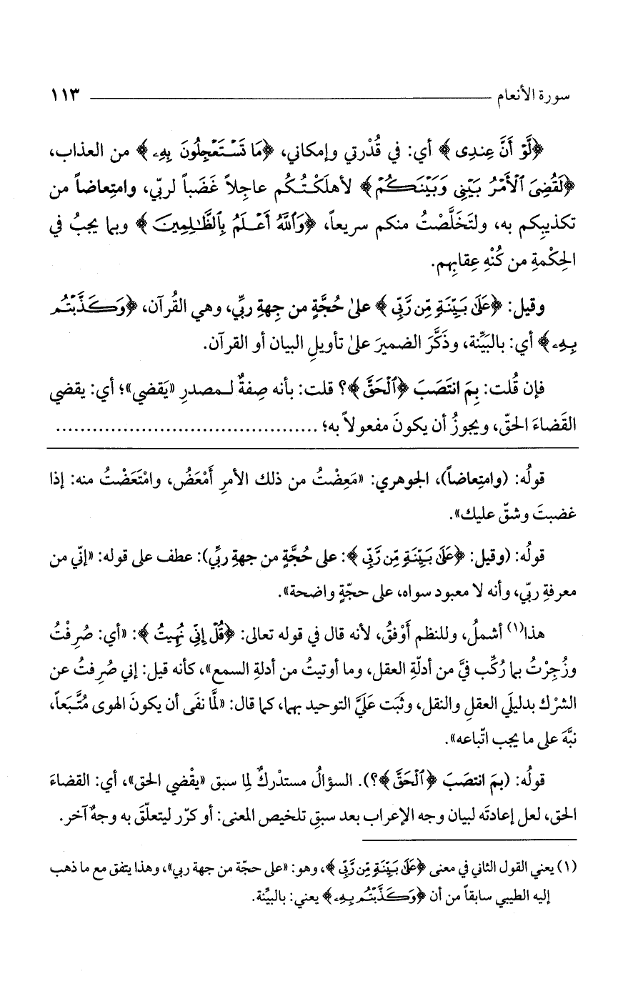 هذا أشمل، وللنظم أوفق، لأنه قال في قوله تعالى: (قُلْ إنِّي نُهِيتُ): "أي: صرفت وزجرت بما ركب في من أدلة العقل، وما أوتيت من أدلة السمع"، كأنه قيل: إني صرفت عن الشرك بدليلي العقل والنقل، وثبت على التوحيد بهما، كما قال: "لما نفي أن يكون الهوى متبعاً، نبه على ما يجب إتباعه".
