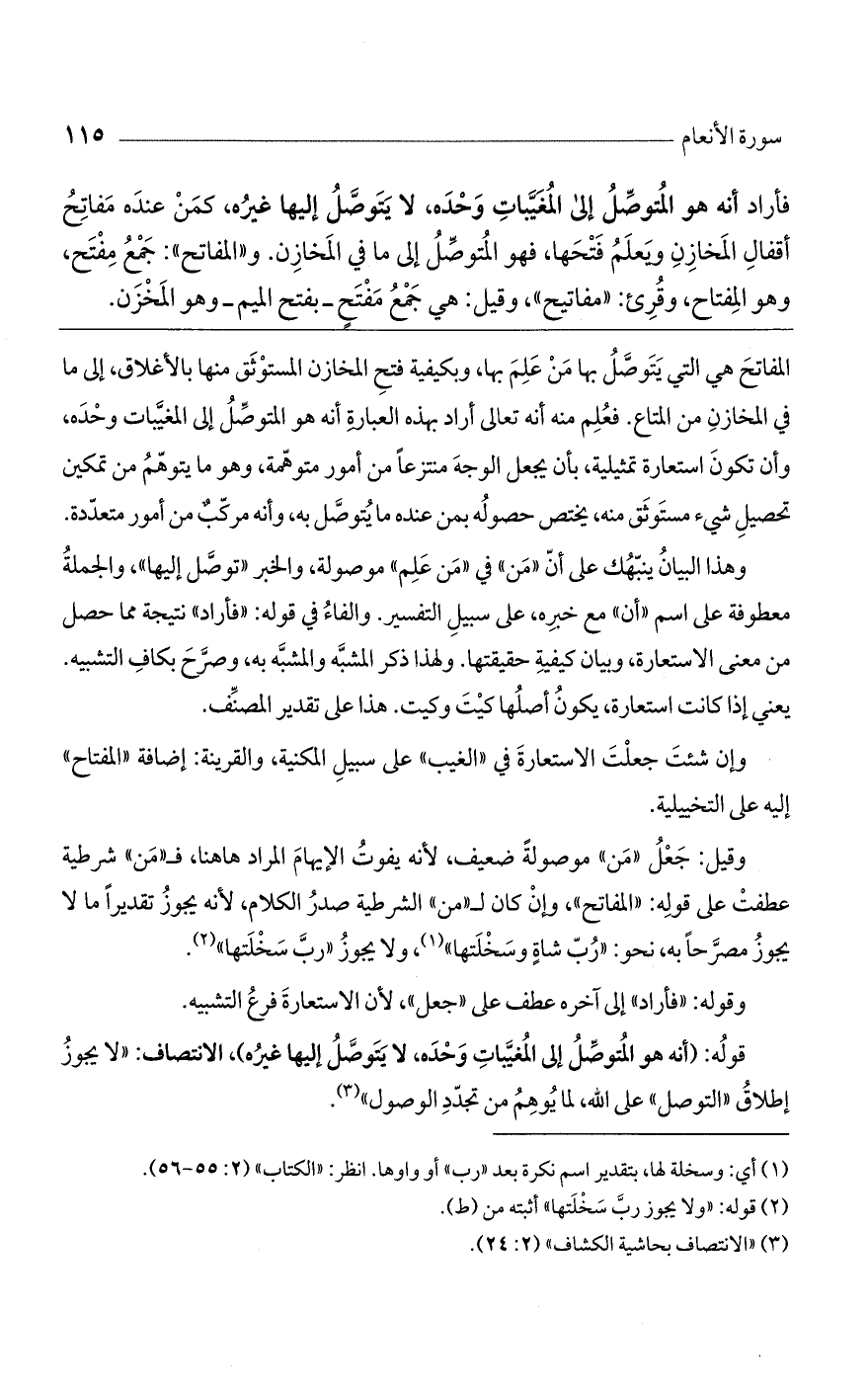 المفاتح هي التي يتوصل بها من علم بها، وبكيفية فتح المخازن المستوثق منها بالإغلاق، إلى ما في المخازن من المتاع. فعلم منه أنه تعالى أراد بهذه العبارة أنه هو المتوصل إلى المغيبات وحده، وأن تكون استعارة تمثيلية، بأن يجعل الوجه منتزعاً من أمور متوهمة، وهو ما يتوهم من تمكين تحصيل شيء مستوثق منه، يختص حصوله بمن عنده ما يتوصل به، وأنه مركب من أمور متعددة.